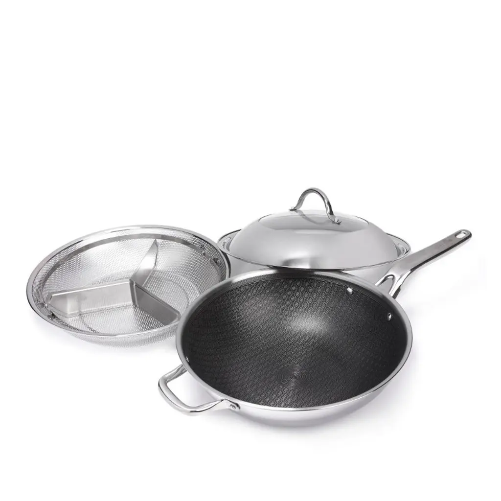 This nonstick 12" diameter chef's pan from Chef Jet Tila, with glass domed lid and mesh steamer (with three-part divided insert) is just the set to elevate your home culinary adventures. With tri-ply clad stainless steel construction, the pan's interior layer is nonstick stainless steel—with an aluminum core in between—for consistent heat distribution. The external layer is also crafted of stainless steel, skillfully designed with induction capability. And for the final touch, it cooks like stainless steel with the benefits of nonstick cleanup, so you can spend less time cleaning up and more time with your loved ones over a great meal. (chef's kiss!) It's been designed by Chef Jet for every type of cooking, for all the yummy recipes you'll create.