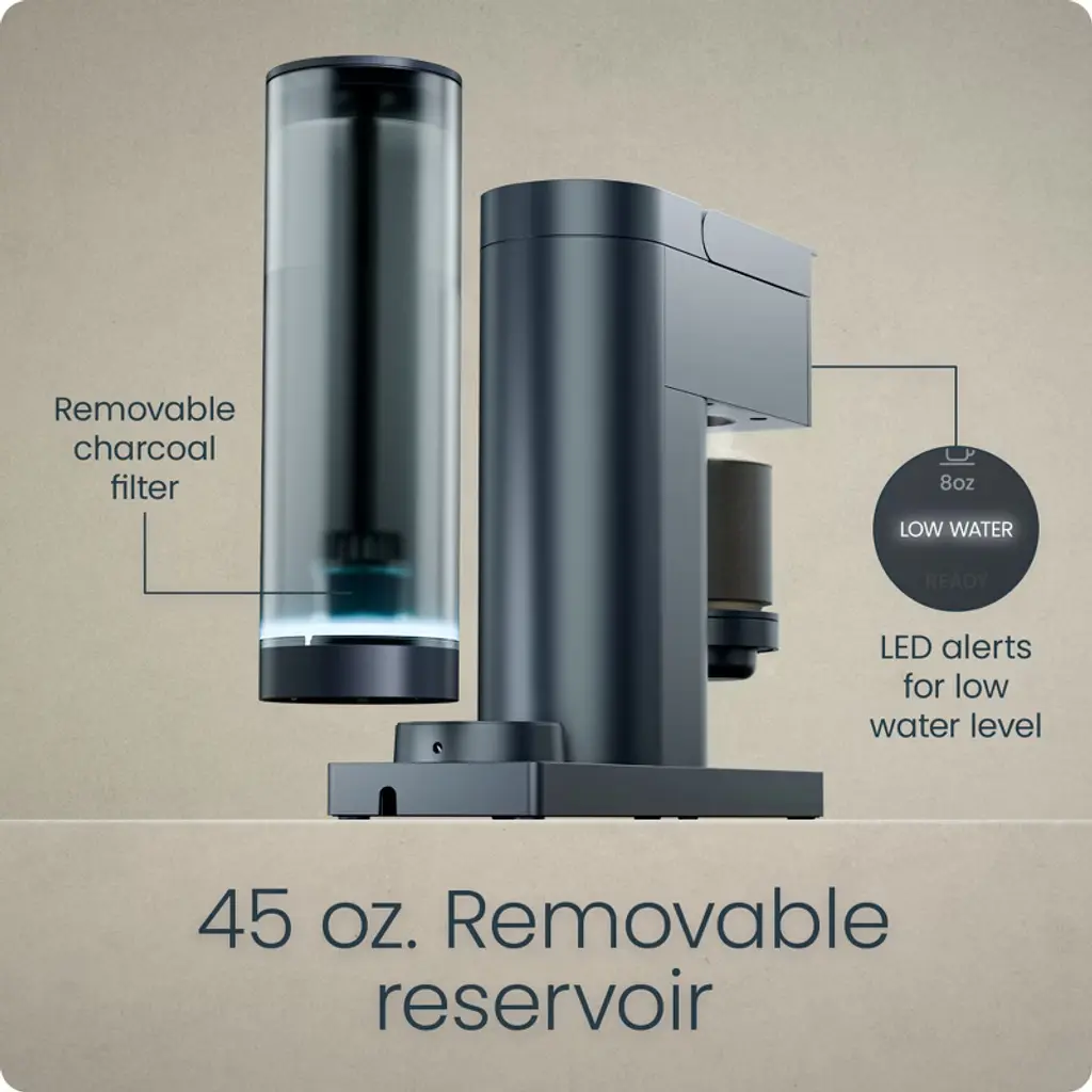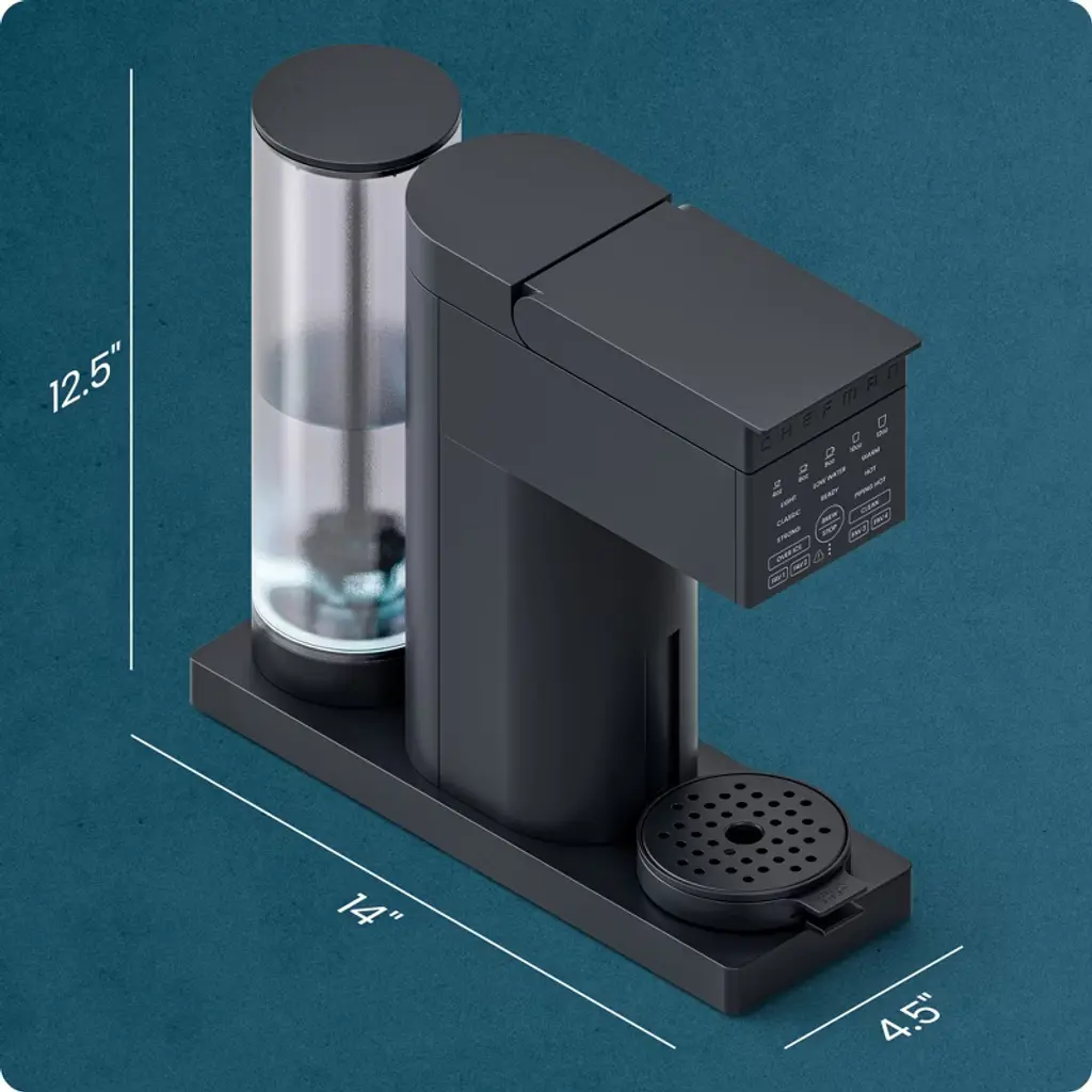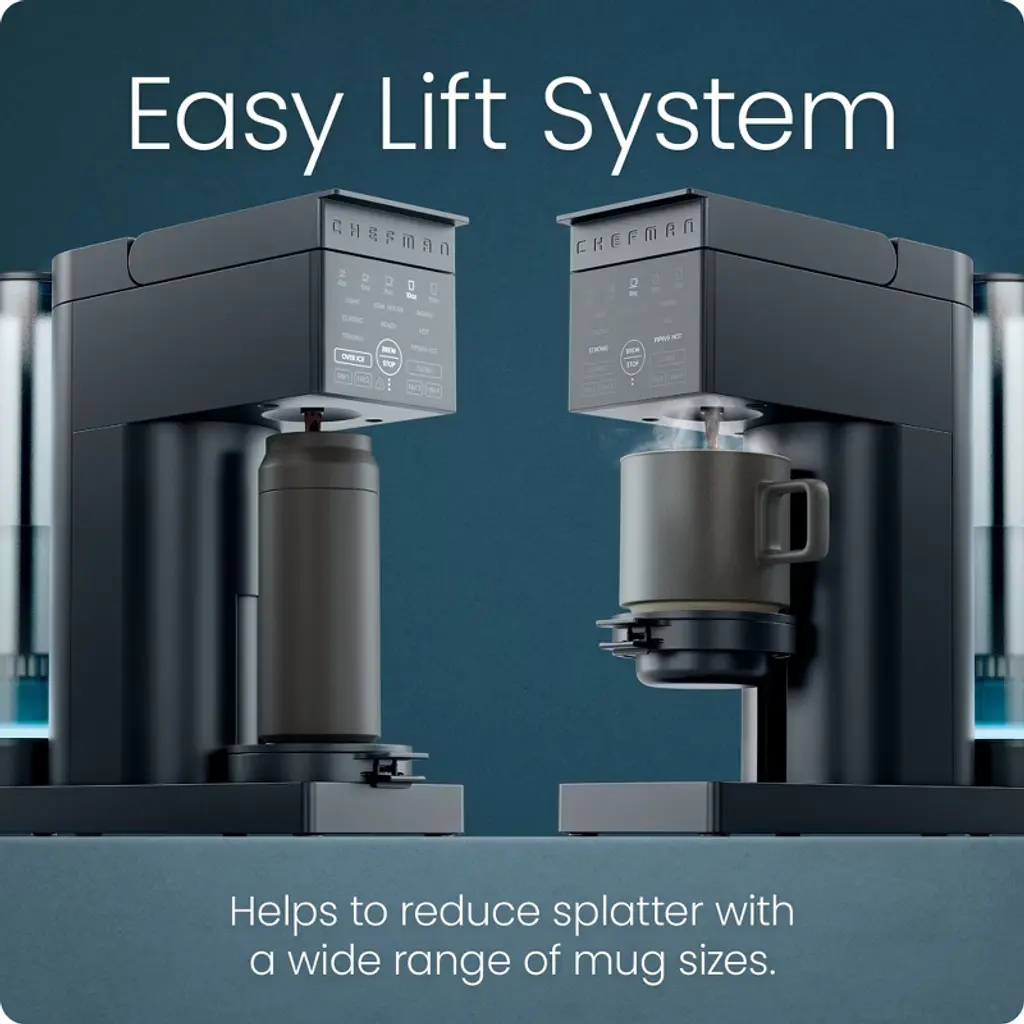 Get excited to wake up and smell the coffee with the Chefman Caffeinator, a single serve coffee machine that helps you enjoy your morning pick-me-up your way. Compatible with both coffee pods and your favorite ground coffee, you can serve up your ideal roast your way. With five size options (4, 6, 8, 10, and 12 ounces), 3 brew strength settings, and 3 temperatures, you can customize your drip coffee to your exact preference. Program each person’s favorite directly into the machine for a delicious one-touch brew. Choose the Over Ice option to lower brewing temperature even further, creating refreshing iced coffee without melting the ice. Adjust your mug height to ensure minimal spatter during brewing. The 48 oz. water reservoir is fully removable and comes with a charcoal filter to keep each cup tasting as fresh as the first. The user guide also comes with five barista-level beverage recipes, from making delicious mochas without an espresso machine to boozy carajillos. With a gorgeous matte-black finish and narrow design, this is a coffeemaker you’ll be proud to show off. cETL approved with advanced safety technology for long-lasting durability and a 5-year assurance provided by Chefman. 1500W/120V - RJ14-DB-MID
