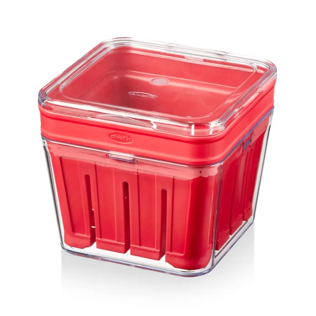 Shaped like a classic berry container, this two-piece container rinses and keeps berries and other produce fresh. The red inner basket has a slotted design that rinses raspberries, blueberries, currants and other delicate produce and allows for air circulation to keep fruit fresher longer. The clear outer container and lid lets you see what's inside and has a stackable design for space-saving storage.