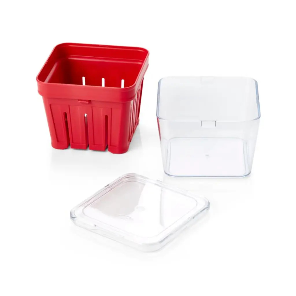 Shaped like a classic berry container, this two-piece container rinses and keeps berries and other produce fresh. The red inner basket has a slotted design that rinses raspberries, blueberries, currants and other delicate produce and allows for air circulation to keep fruit fresher longer. The clear outer container and lid lets you see what's inside and has a stackable design for space-saving storage.