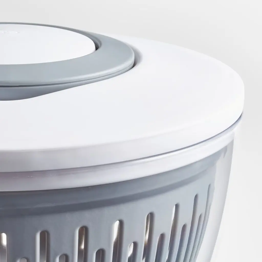 Go from zero to salad in no time with this ingenious spinner that rinses, dries and chops greens. Simply load arugula, spinach or chard in the basket, rinse well and place in the clear bowl. Press the top to spin leaves dry, then add the plastic chopping blade and spin again to chop. The bowl goes right to the table to serve salad. The Chef'n salad spinner and chopper in grey and white is exclusive to Crate & Barrel.
