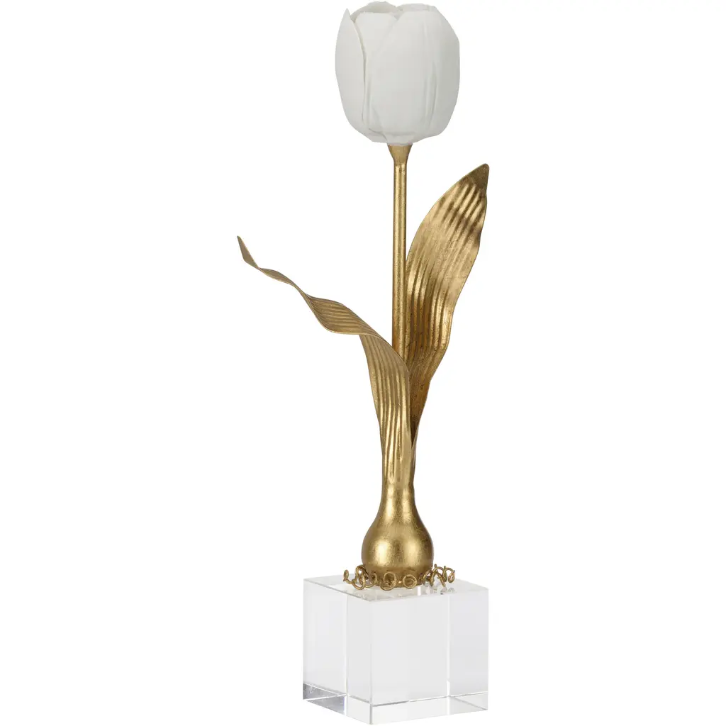 Bring The Elegance Of Nature Into Your Home With This Small Porcelain Tulip. Featuring Antique Gold Leaf On Iron, The Leaves And Stem Support A Hand Crafted, Matte White Tulip Blossom. A Square Clear Crystal Stand Braces The Delicate Tulip Stem. Beautiful From All Sides, This Eye Catching Accent Is Ideal For Displaying On A Cocktail Table In A Living Area Or Console Table In The Foyer.