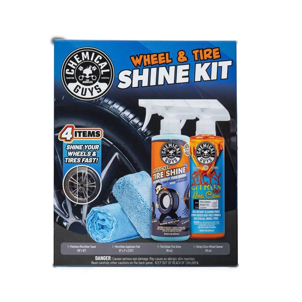 The Chemical Guys Wheel & Tire Shine Kit is your one-stop shop for taking your wheel game to the next level with four essential products that restore your wheels and tires’ long-lost shine! Your wheels and tires are the dirtiest part of your car- give them the attention they deserve with this easy-to-use kit! Start with Sticky Citrus Wheel Cleaner, a specially formulated gel spray that clings to your wheels to lift off stubborn, stuck-on brake dust and grime, allowing you to easily wash them away. Next, apply Tire Kicker Tire Shine with the included Premium Grade Microfiber Applicator to protect, restore, and leave your tires looking like new with a vibrant showroom-quality shine. With Chemical Guys Wheel and Tire Shine Kit, you're two easy steps away from the best-looking wheels your ride has ever rolled on!