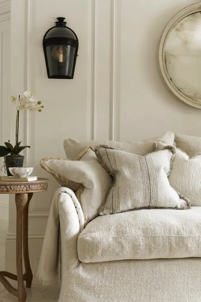 2A glamorous two-tone cushion, fronted with Sanremo, a small chenille herringbone inspired by the small town in the Riviera dei Flori, famous for its music and culture. Backed in plain Atrani Linen and paired with the luxurious White, Russian, Stormy, Amaretto, Moscow Mule, or Dirty Martini trim to complete the look, this cushion sits beautifully next to the prints, geometric weaves, and mohair in the Veneto collection.This cushion is stuffed with our signature plush feather inners, sustainably sourced from Scandinavia, with 50% recycled feather from recycled duvets and jackets.Made In The UK - Ecru, Gray, Brown, Blue, Olive