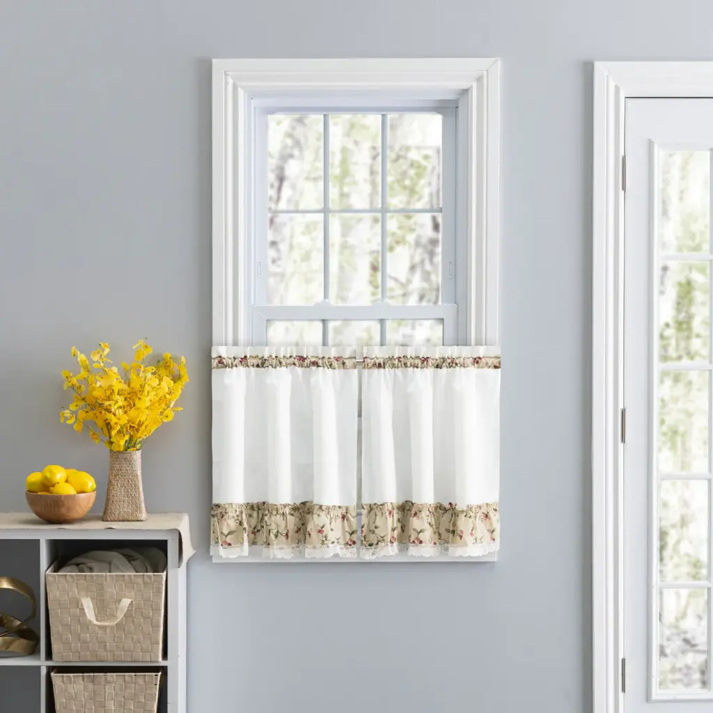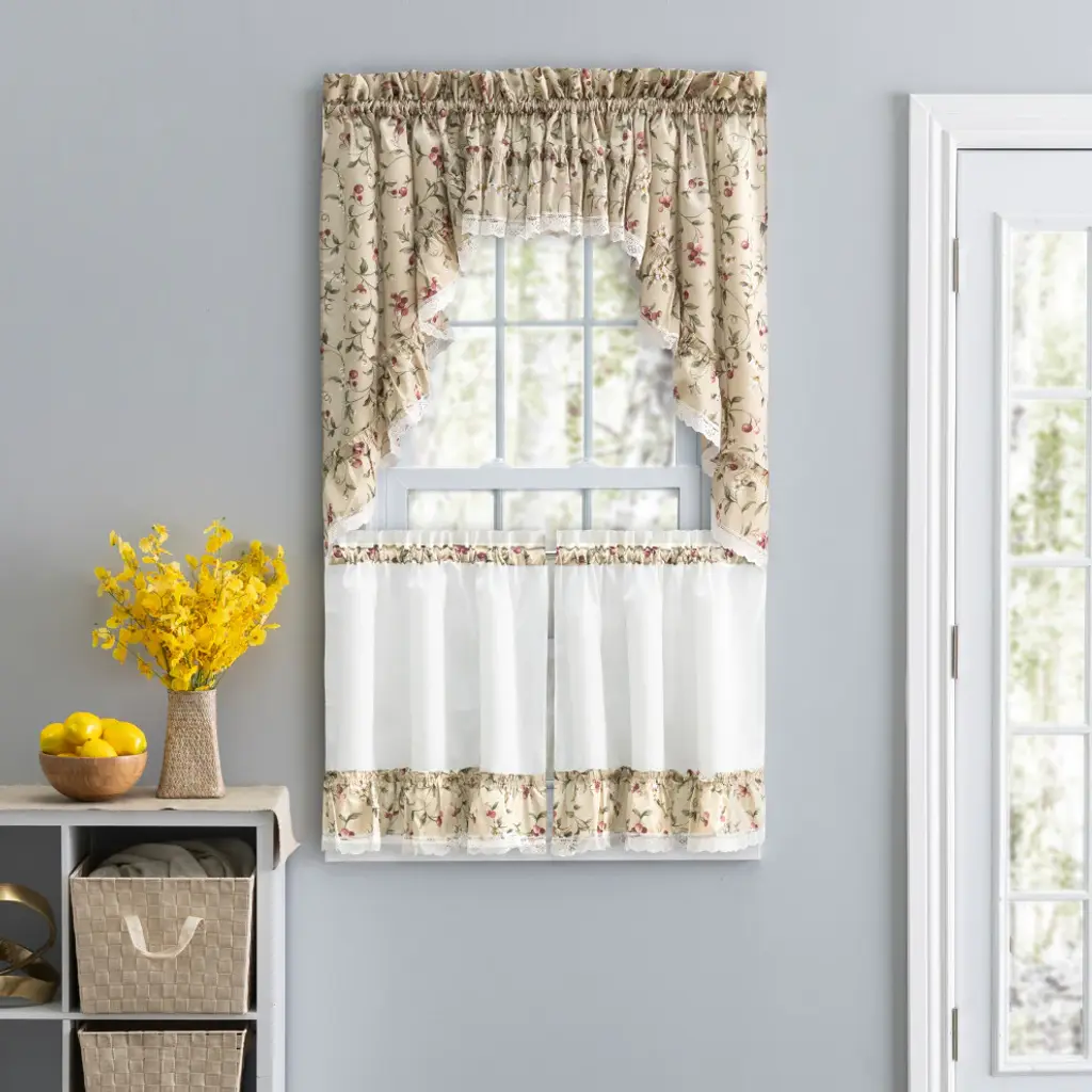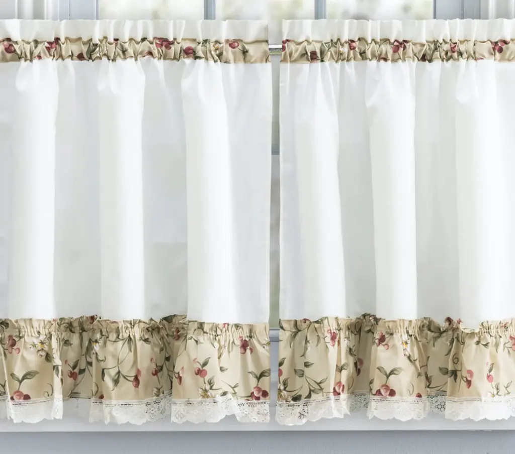 We''ve designed our Kitchen Collection Line with three things in mind. To have beautiful printed patterns, be machine washable and inexpensive. The Cherries Collection is an elegant pattern of cherries, vines, leaves and floral blossoms on a solid background that will reflect the atmosphere, mood and theme that you are looking to create in your kitchen. Tailored Tier curtains are used to cover the lower portion of your windows or used alone on shorter length windows. Made from 70-percent polyester/30-percent cotton creates a sturdy curtain that is extremely durable and will hold its color and shape even after repeated washings. Each curtain has an ivory back panel and is constructed with a standard 1-1/2-Inch printed rod pocket, 1-Inch header and printed ruffled bottom with lace trim accent. Sold in pairs (2 Panels) Length is measured overall 36-Inch from header top (ruffle above the rod pocket) to bottom of panel. Width is measured overall 58-Inch per pair of panels (both 29-Inch panels together) for wider windows simply add multiple sets together. Conveniently machine washable, Made in the USA.