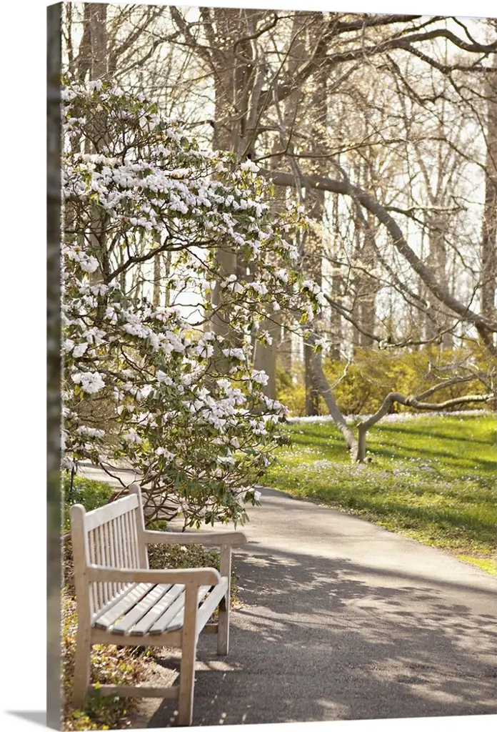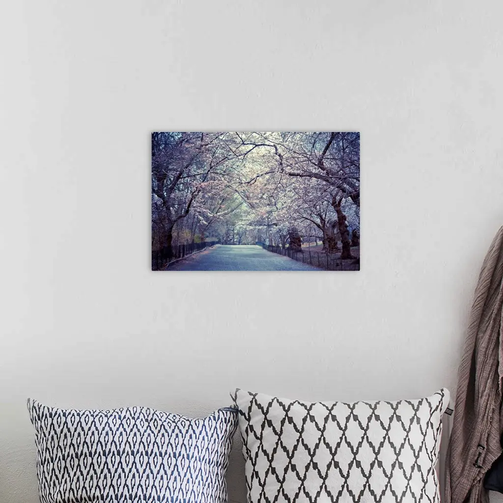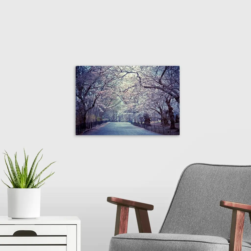 A gravel path is shown under blossoming cherry trees in Central Park in New York City, New York (NY).