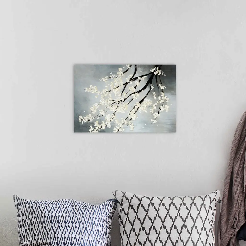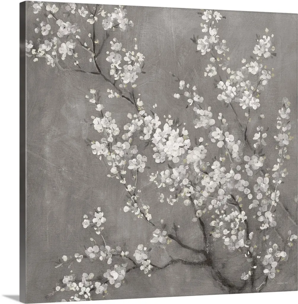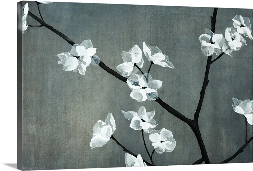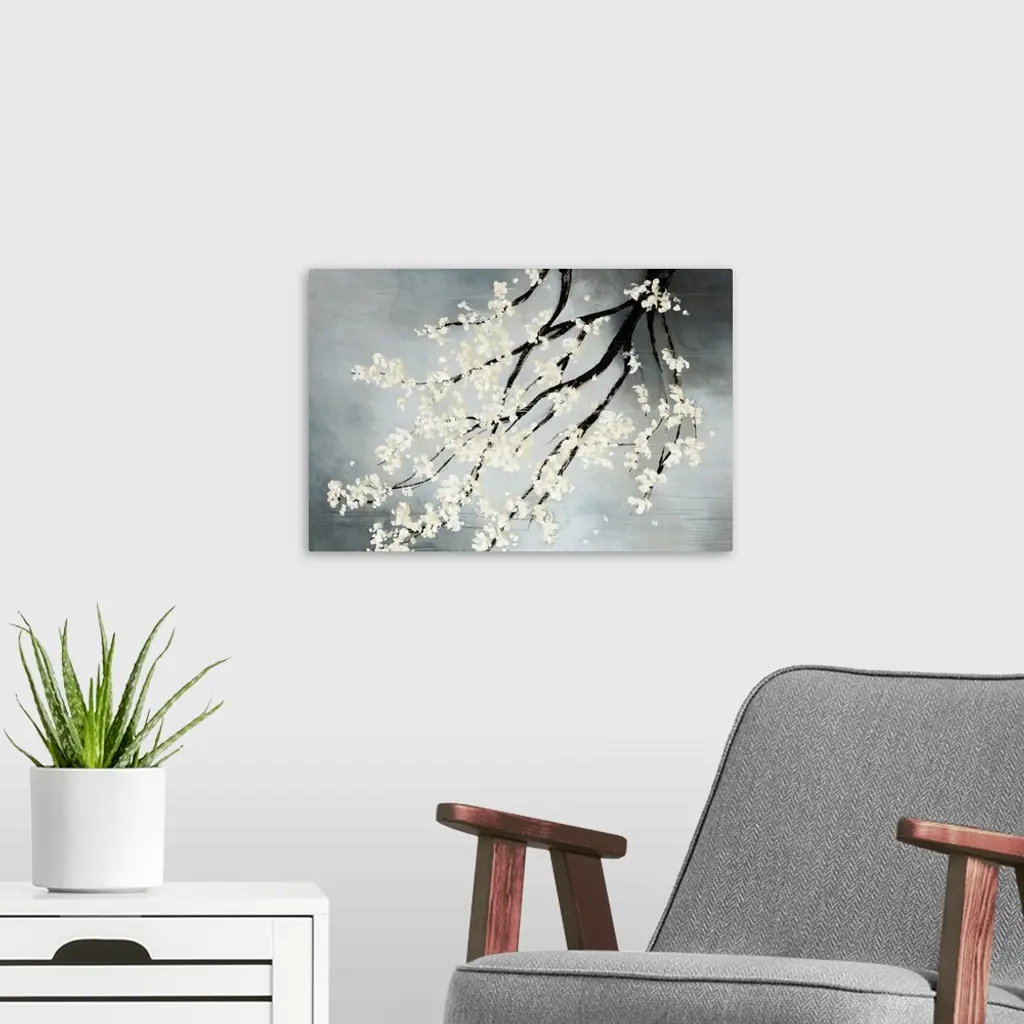 Contemporary drawing of blooming white flowers on the dark branches of a cherry tree hanging down from the top.