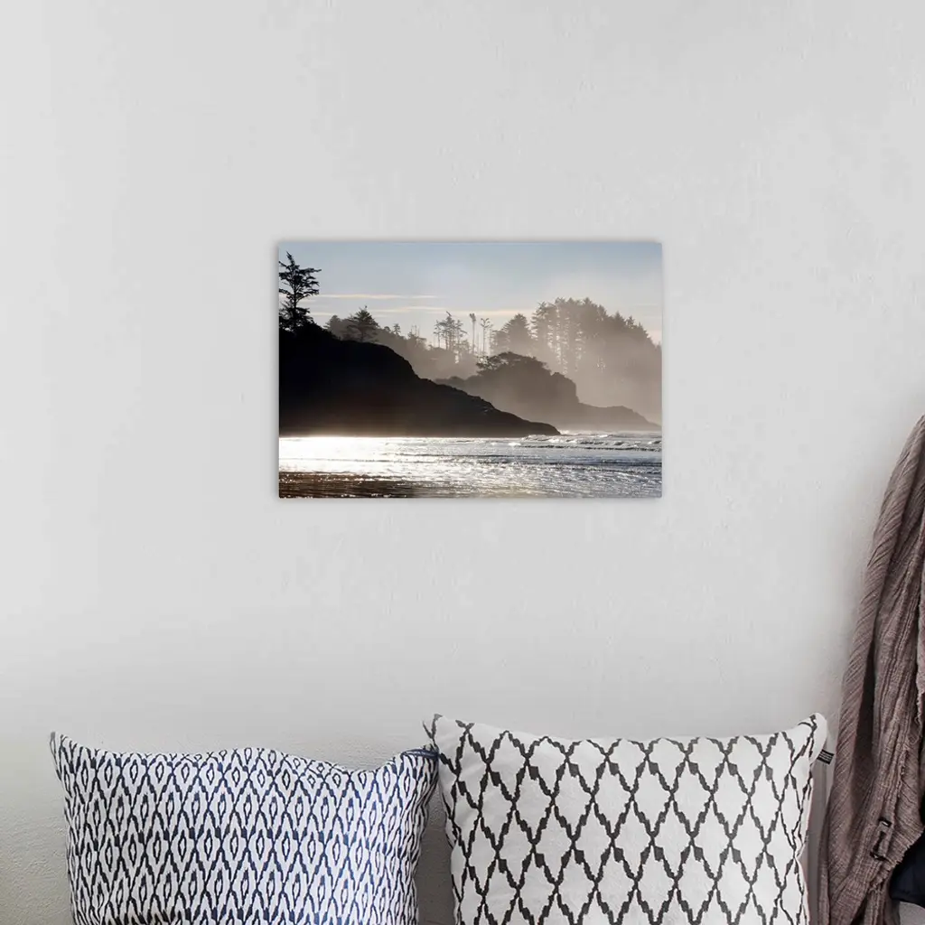 Mist rises of the sea against the silhouettes of rocks and trees in this shore line photograph taken in the morning.