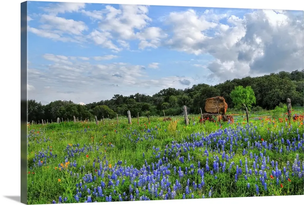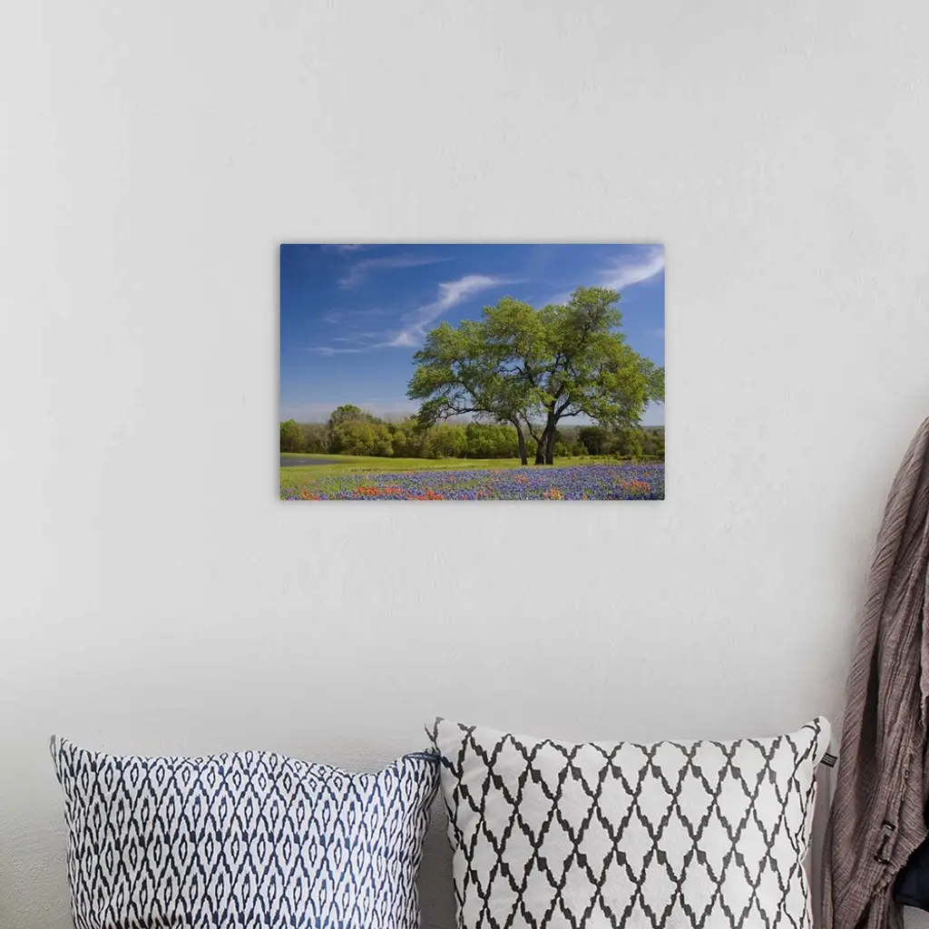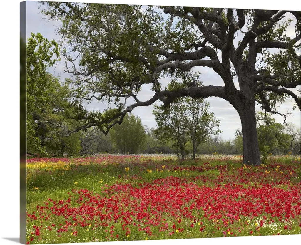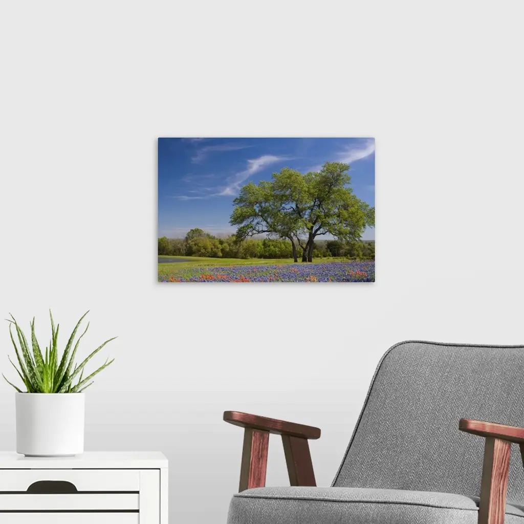 Chestnut Oak - Quercus Muehlenbergii - In Field Of Texas Blue Bonnets