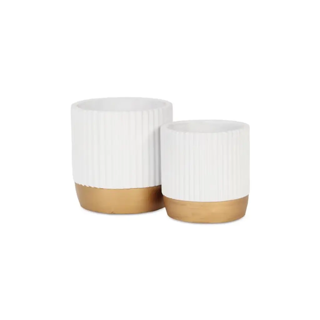 Bring home a natural touch that complements outdoor themes and lush looks. Made from ceramic materials to create a unique look, this piece features a ridged pattern in a white finish with a sleek gold accent base. Let it complete your space today and add an eye-catching element!
