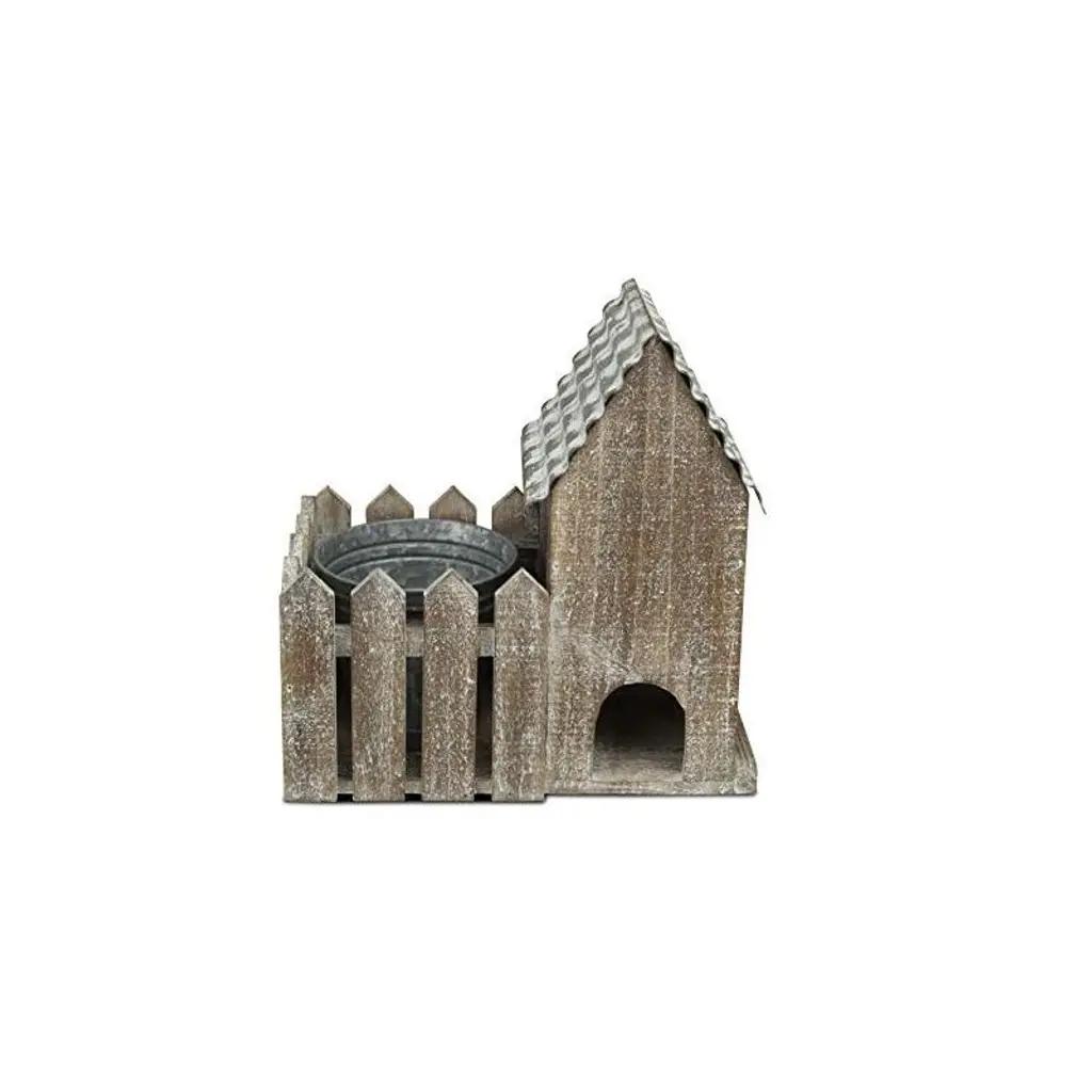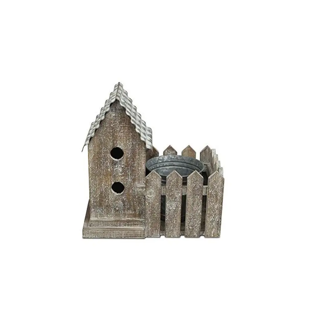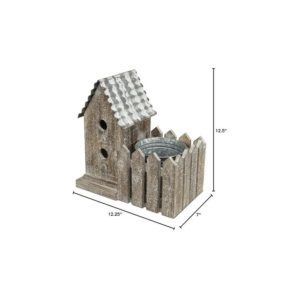 Serving as both a decorational and functional piece, birdhouses help complete themes ranging from Farmhouse to traditional garden. This piece in particular features a 2 story design with a metal roof and a galvanized pot enclosed in a picket fence. Whether serving as a shelf decor piece or an entryway addition, this birdhouse will complete any look.