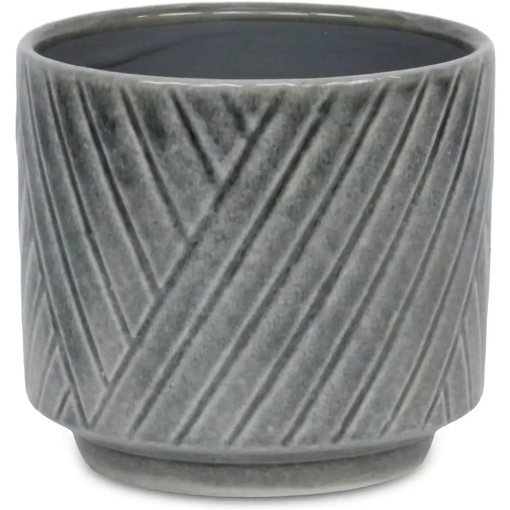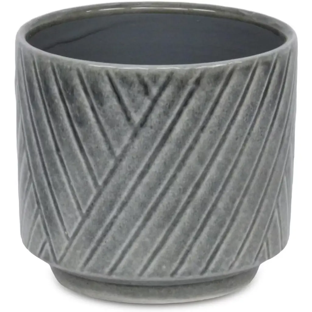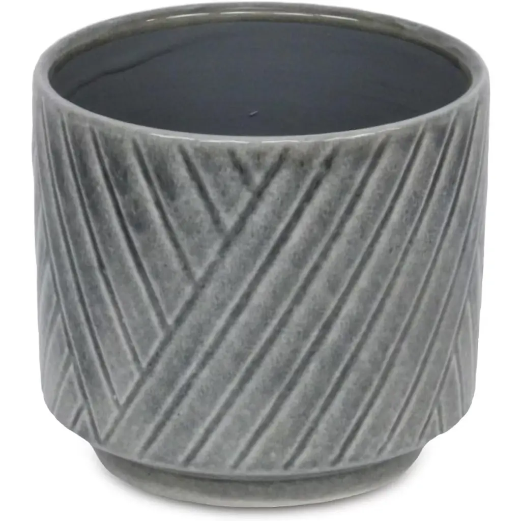 A diverse and dynamic home encompasses various types of materials to provide a well-bodied look. Ceramic has been a tried and true material with a fresh modern look for the homes of today. This gray pot in particular features a straight side body with an inlet base and a cross diagonal pattern. Bring a new element into your space with this ceramic piece and let it complete the look of your home or office.