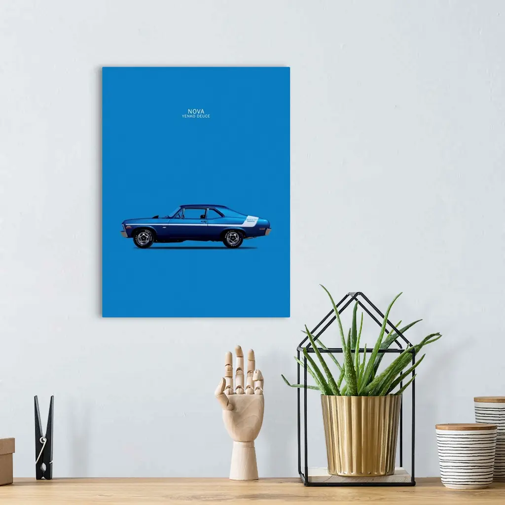 Photograph of a blue Chevy Nova 350 Yenko Deuce 70 printed on a blue background