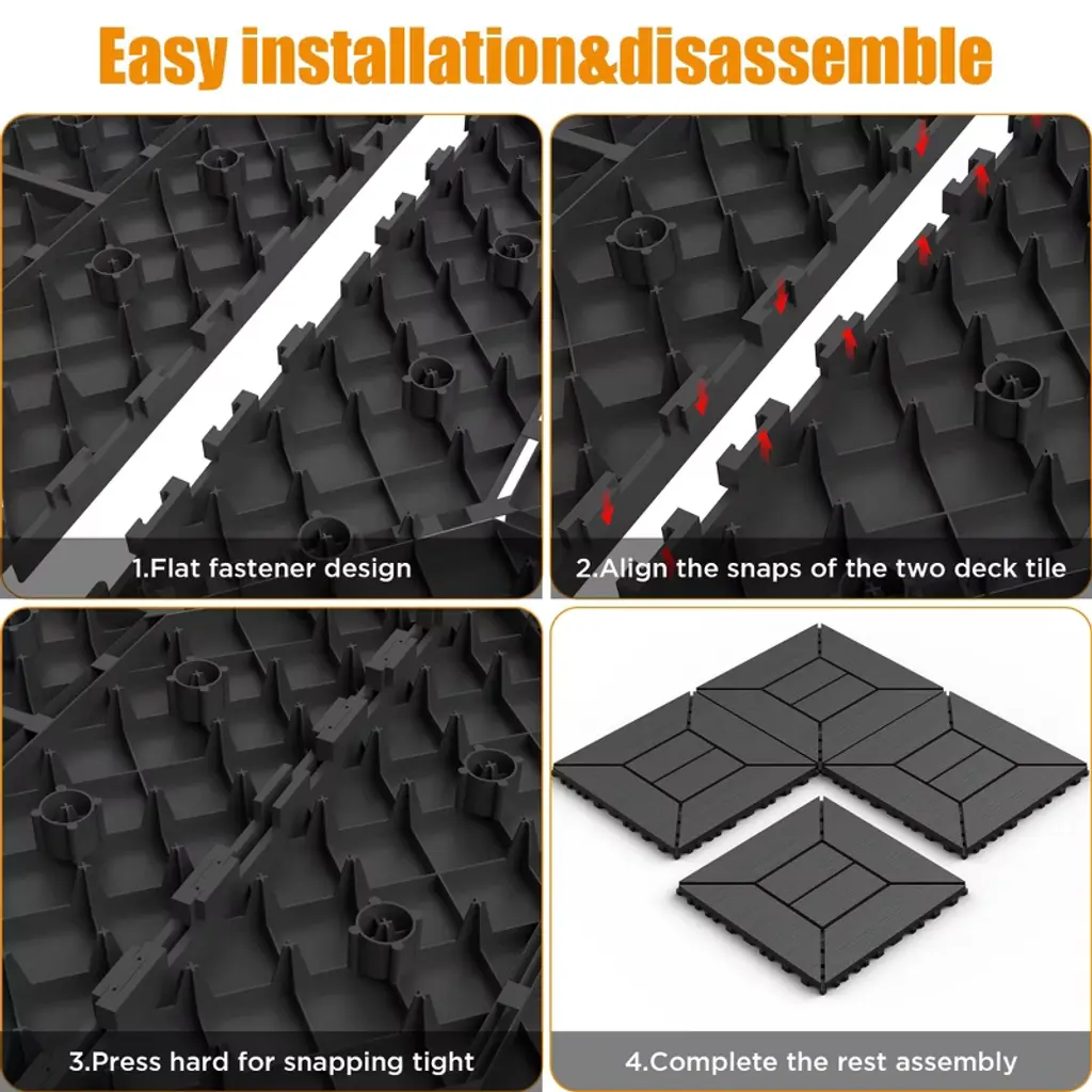 • Single Size: 12" length x 12" width x 0.8" height. • Easy to install, solid and reliable.Strong structure, suitable for all scenarios • Made of PP material. It has strong load-bearing capacity. • Perfectly tiled courtyard tiles, balcony tiles, bathroom and any indoor or outdoor setting. • Scene picture is for reference only, product color is subject to the actual object, picture color difference is not accepted for refund. • Light angle issue, there may be a certain color difference between the product and the actual object, please use it on a flat surface.