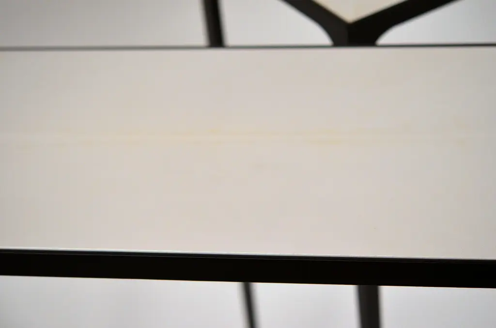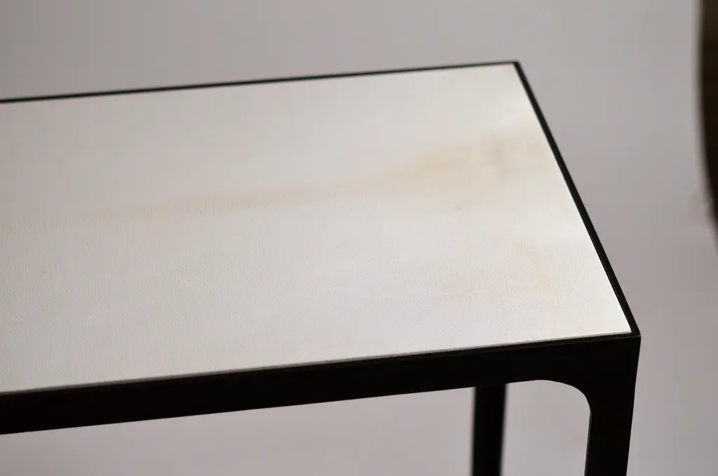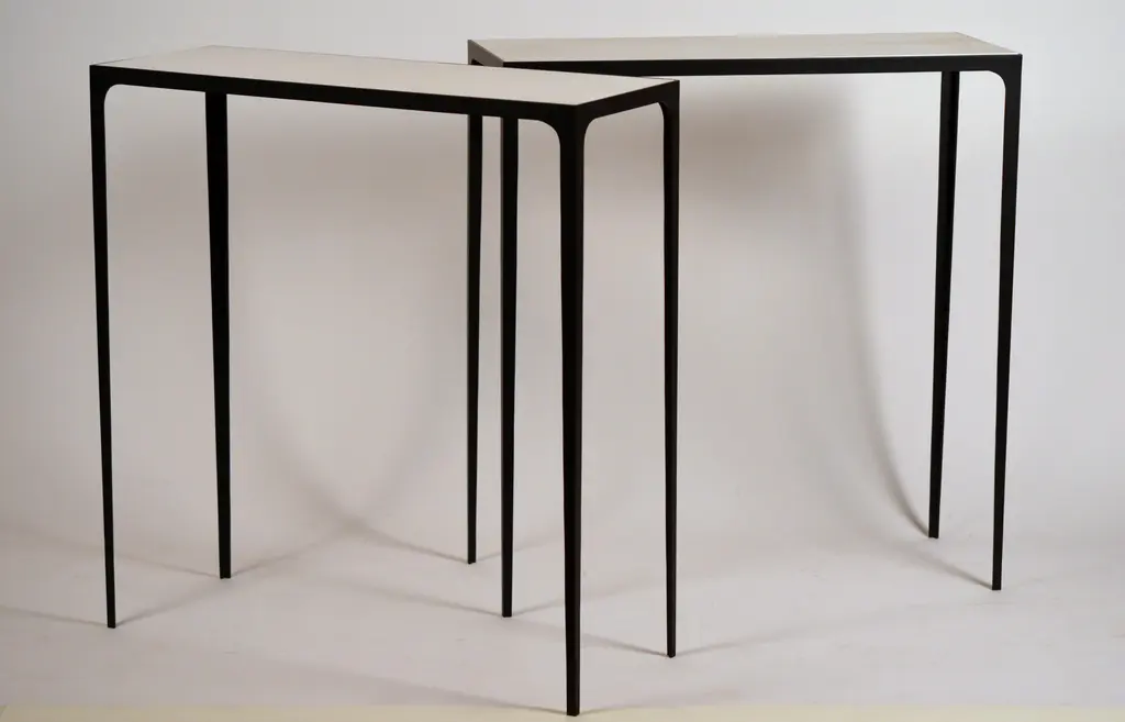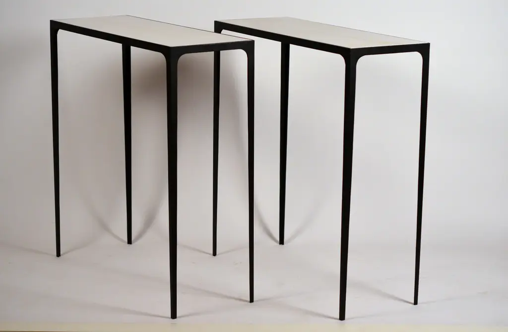 Pair of chic 'Esquisse' wrought iron and parchment consoles by Design Frères. Contrasting white/cream goat parchment top over blackened slender steel base. Beautifully simple, understated design. Difference sizes, base finishes and tops are available. Please search for "Esquisse consoles or tables by Design Frerès" for the other versions or please inquire.
