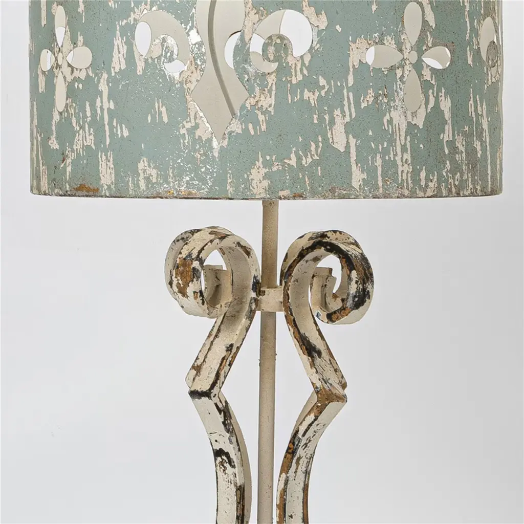 This vintage light features a rustic metal lamp design with an ornate base incorporating elegant scrollwork, finished in a distressed white hue, making it a charming rustic style lamp or decorative desk lamp. Its industrial lamp influence is evident in the iron table lamp structure, adding a modern rustic touch suitable for a bedroom table lamp or cozy home light. The metal shade lamp with cut-out fleur-de-lis patterns allows light to filter through decoratively, creating a warm ambiance. Topped with a matching finial, this unique desk lamp combines layered textures with vintage appeal, making it an ideal industrial lamp or vintage light for any interior setting.