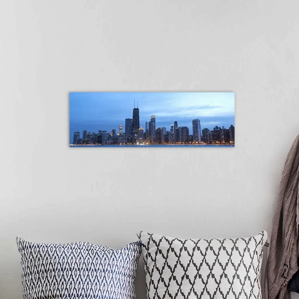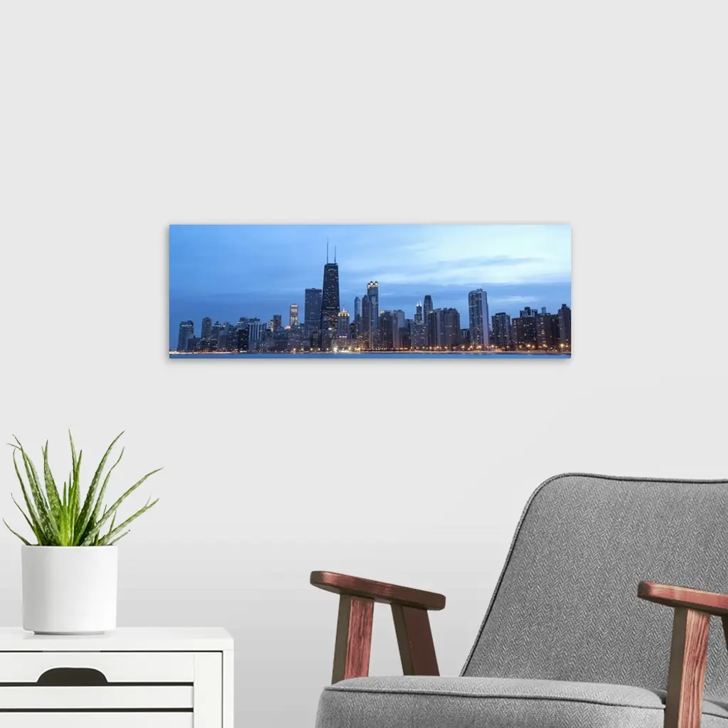 Panoramic view of the Chicago city skyline illuminated in the early evening, seen from across the water.