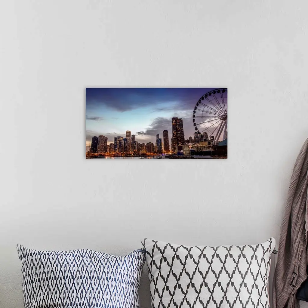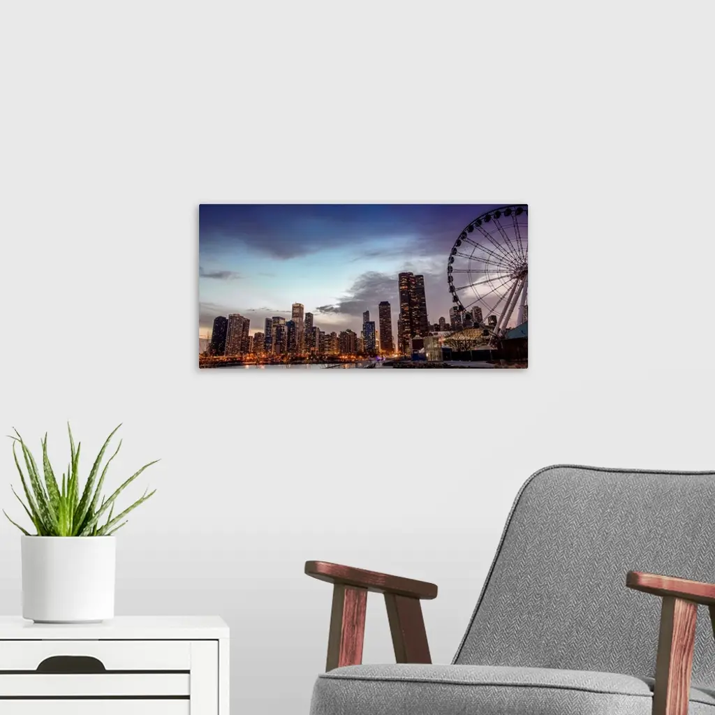View of the Chicago city skyline illuminated in the early evening with a Ferris Wheel in the foreground.