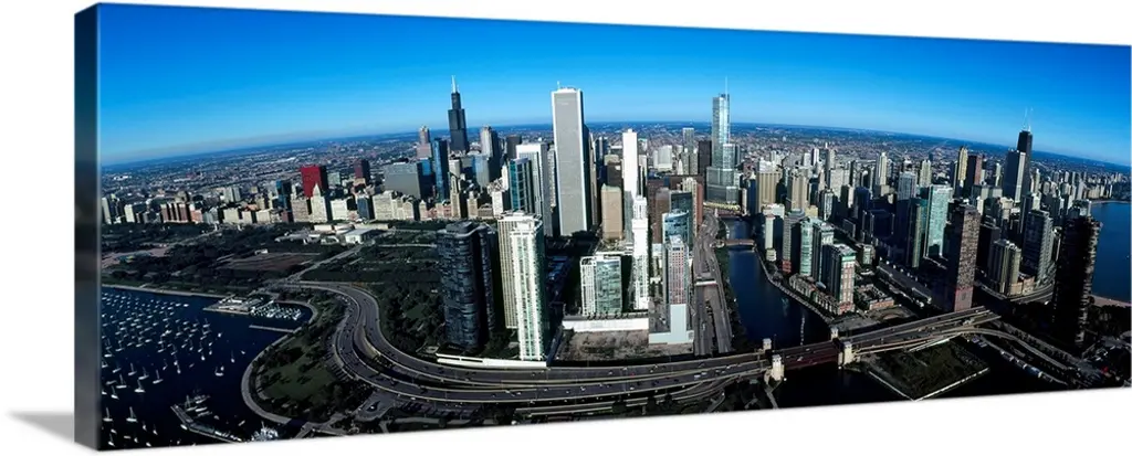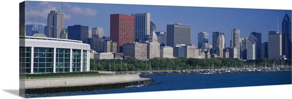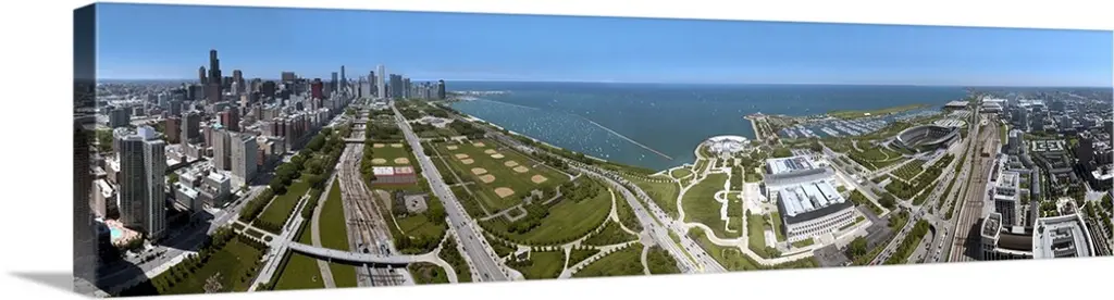 Giant panoramic photo of downtown Chicago, Illinois (IL). Skyscrapers and boats in Lake Michigan are visible.