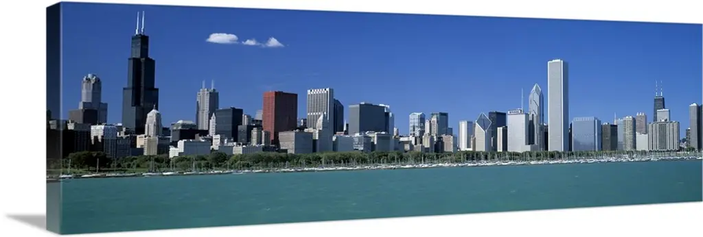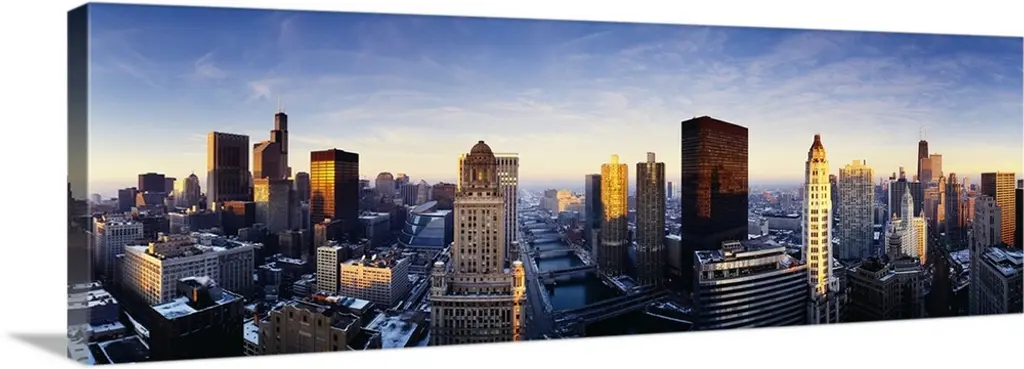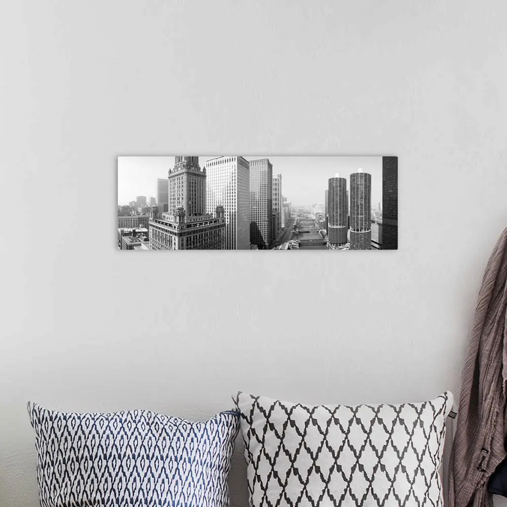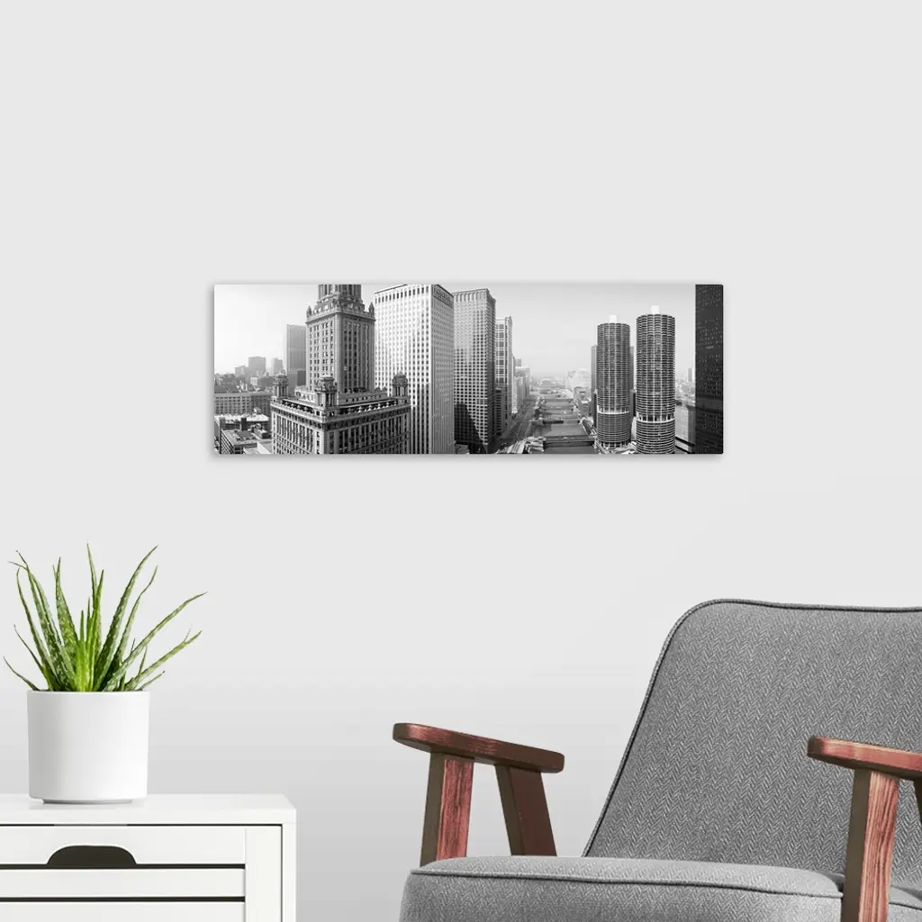 Huge monochromatic photograph taken from an aerial view looks down a river encased by tall skyscrapers within the largest city of Illinois. The various buildings of this city can be seen extending towards the horizon.