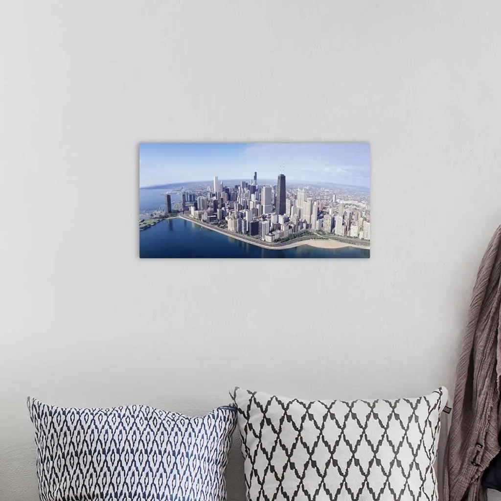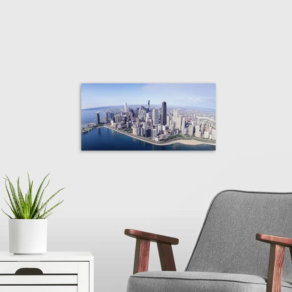 Large, landscape aerial photograph of the large city of Chicago, Illinois, surrounded by calm blue waters.