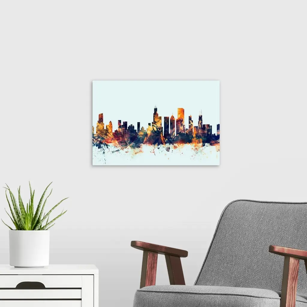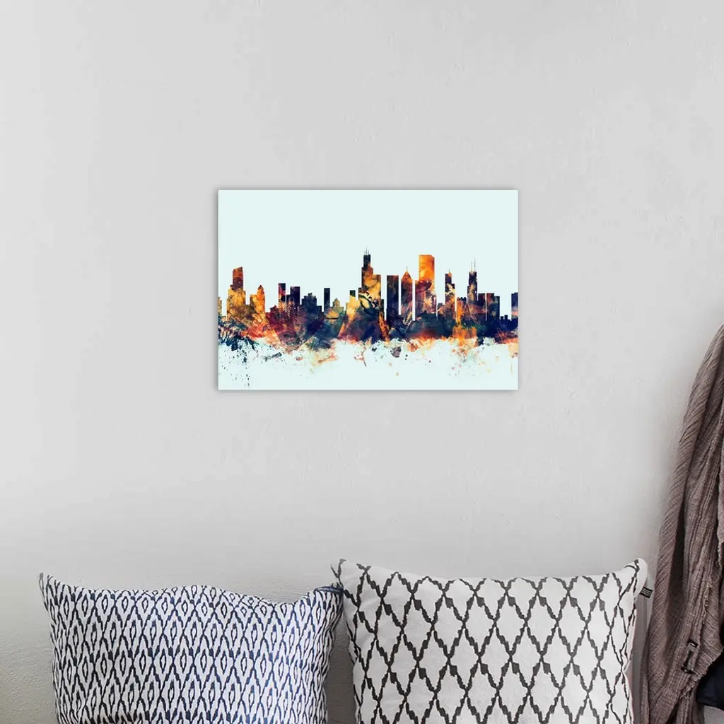 Dark watercolor silhouette of the Chicago city skyline against a light blue background.