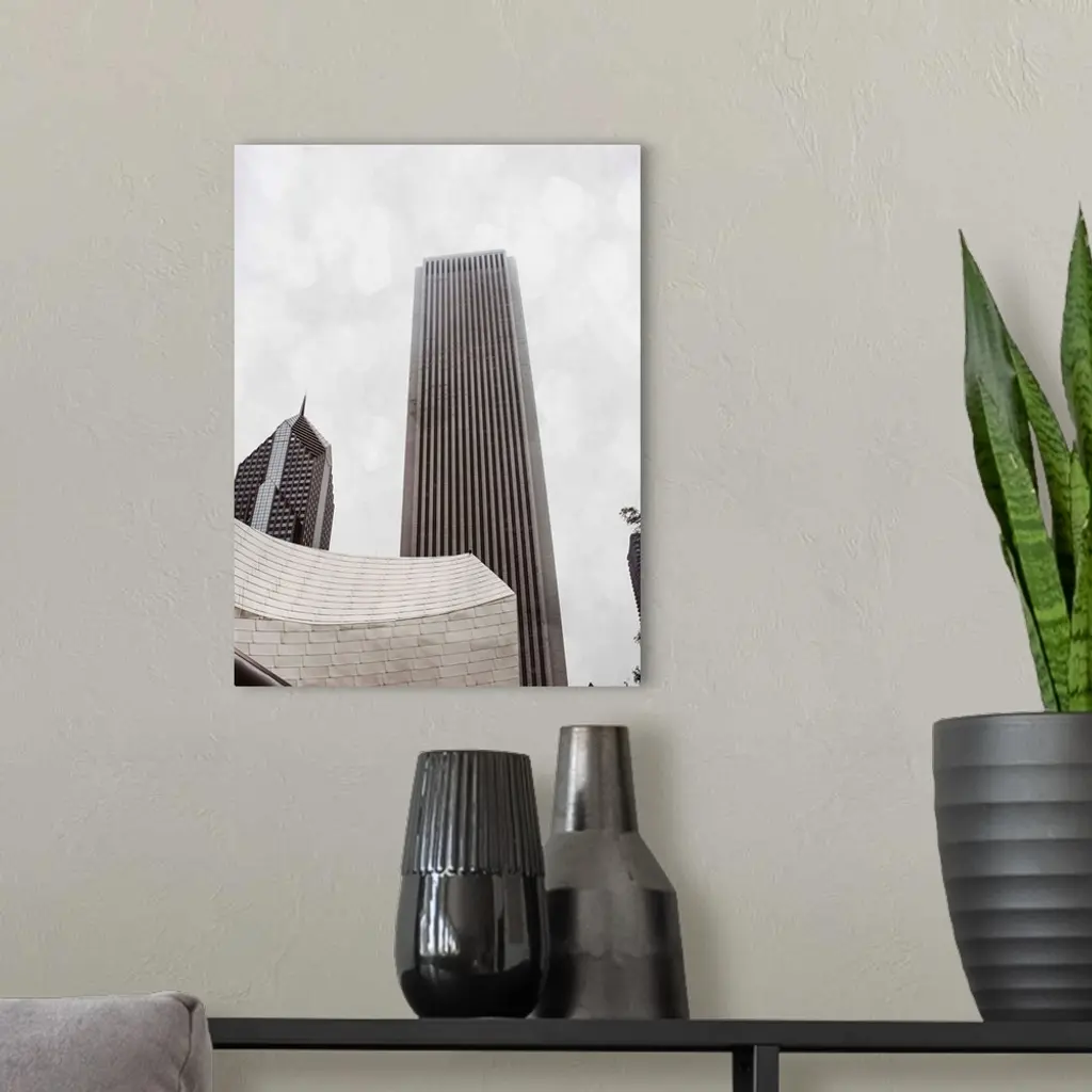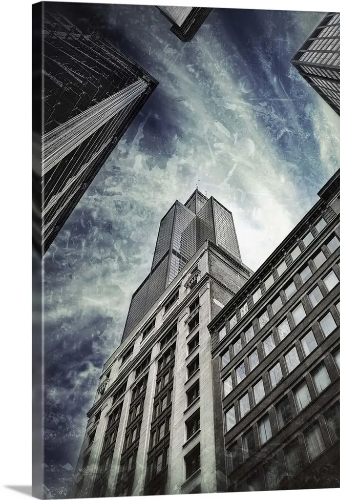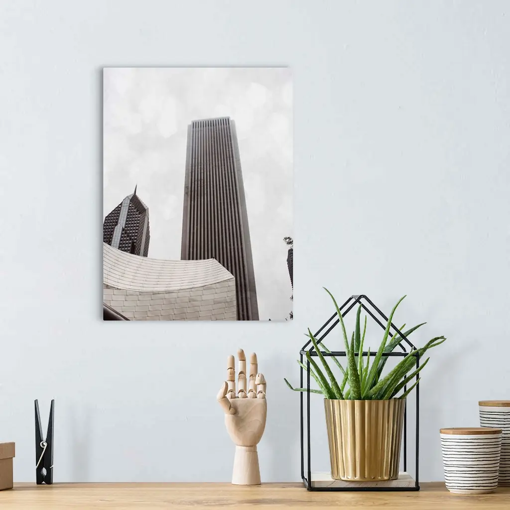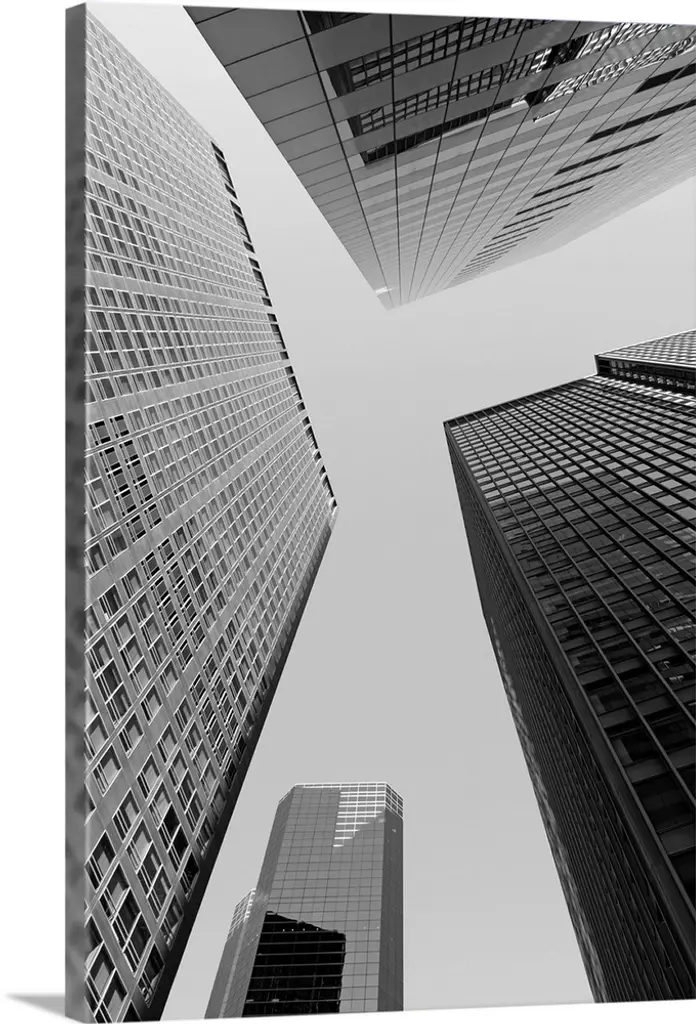 In this photograph of skyscrapers, elegant architectural details overlap one another to create a compelling synergy.