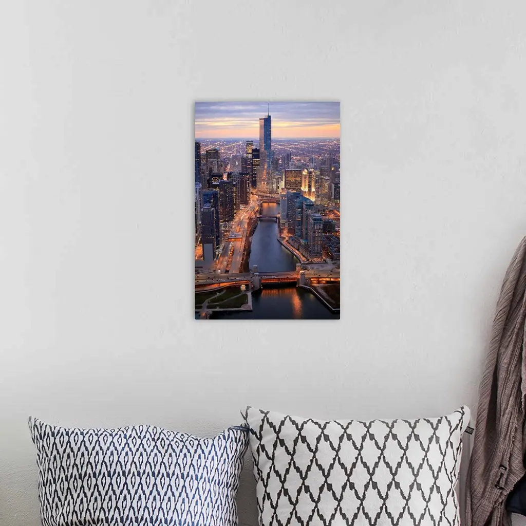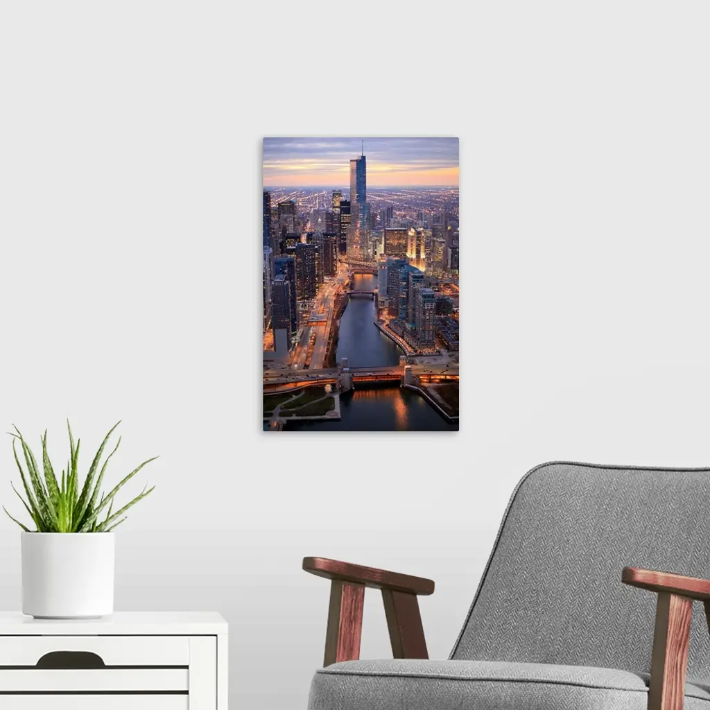 Chicago River And Trump Tower From Above During Sunset With Clear Crisp Skies.