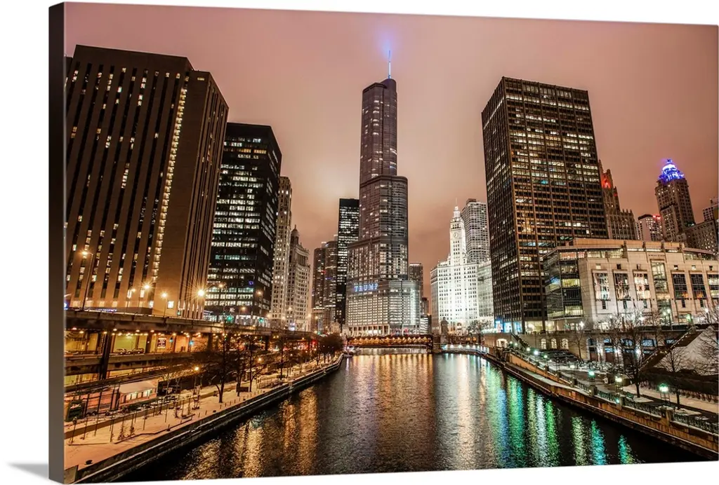 Chicago River Walk with urban skyscrapers illuminated with lights and water reflection at night.
