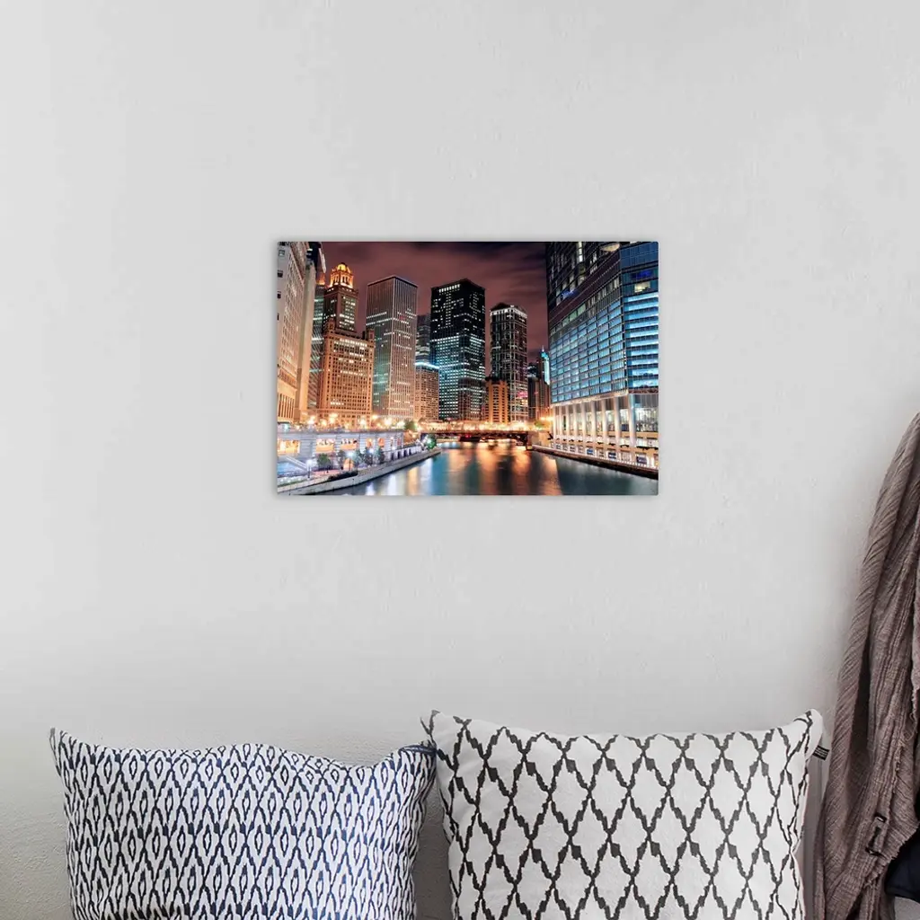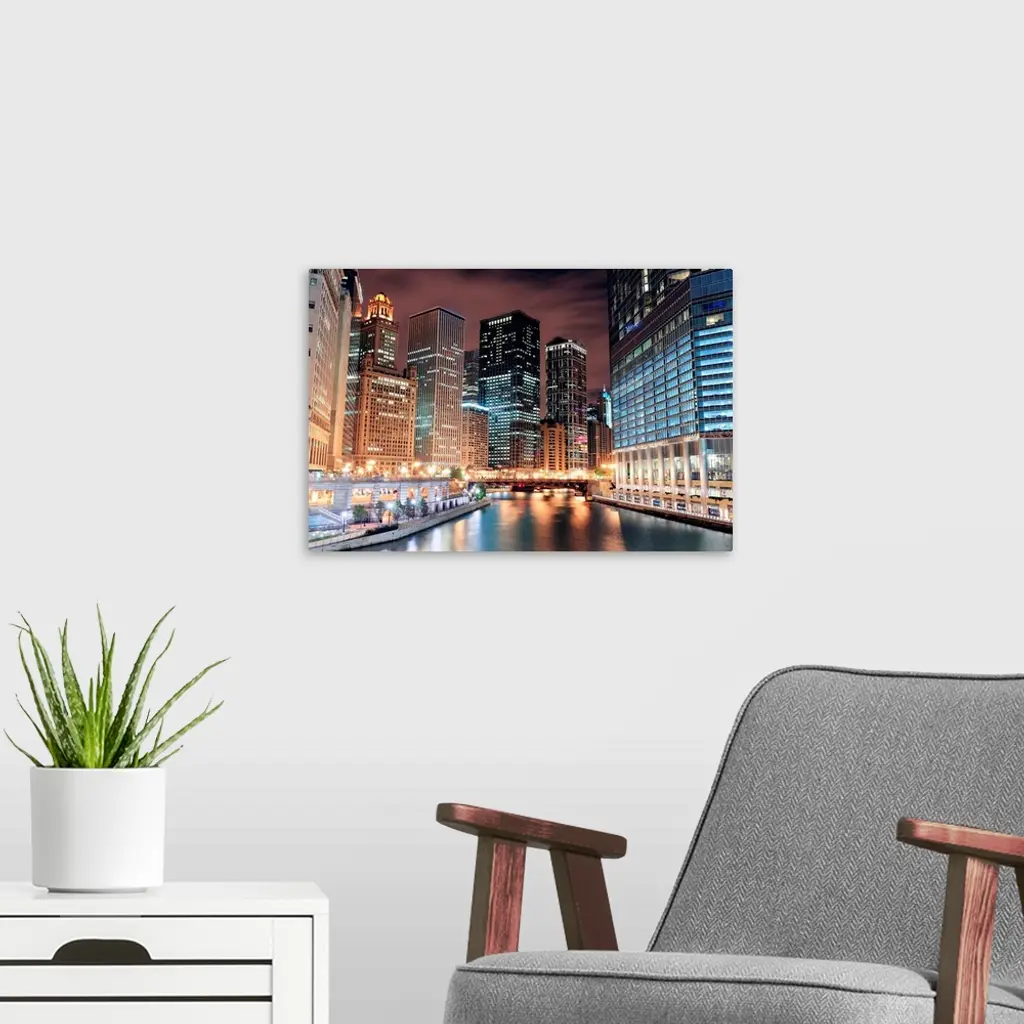 Chicago River Walk With Skyscrapers Illuminated At Night