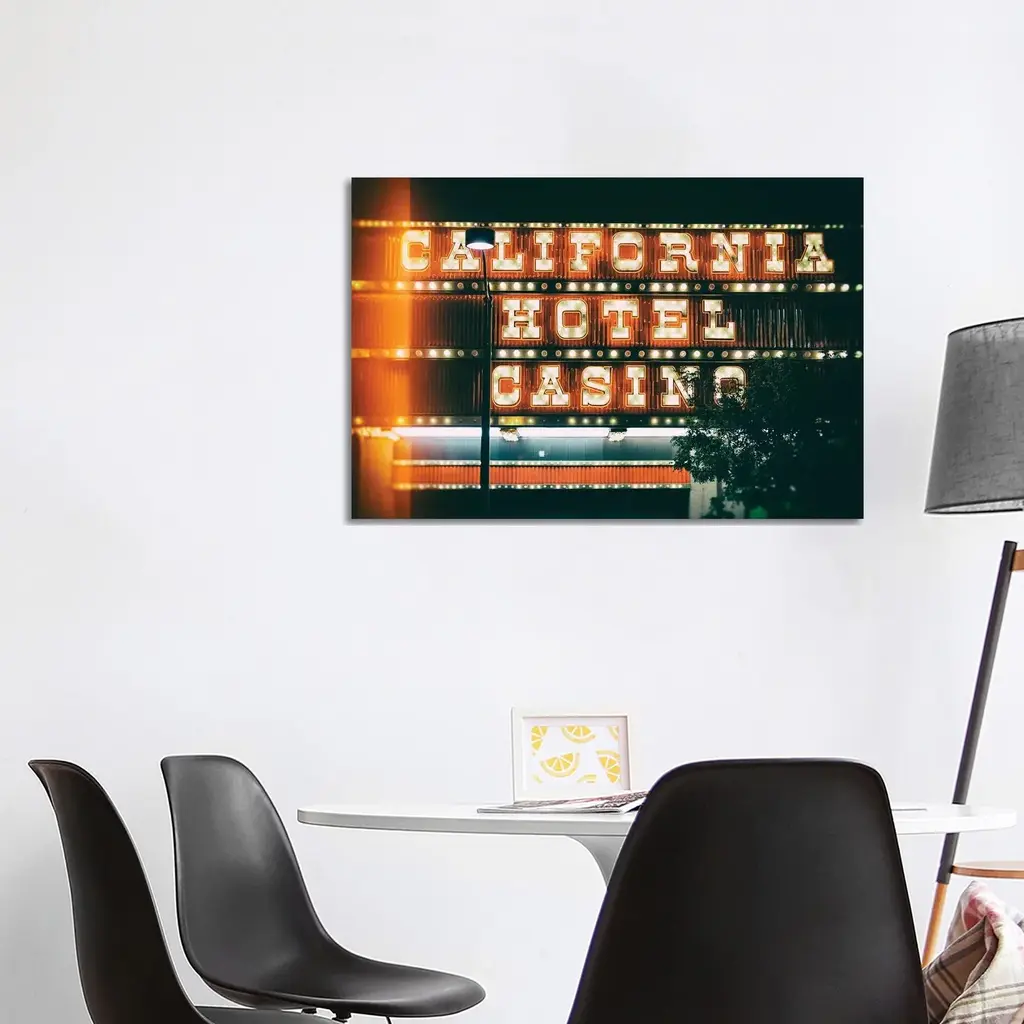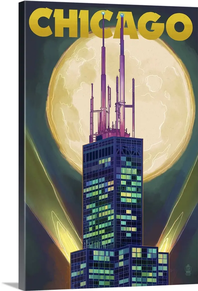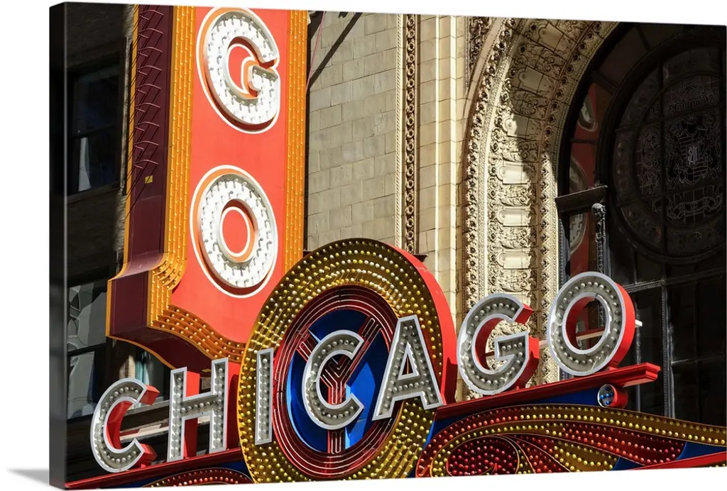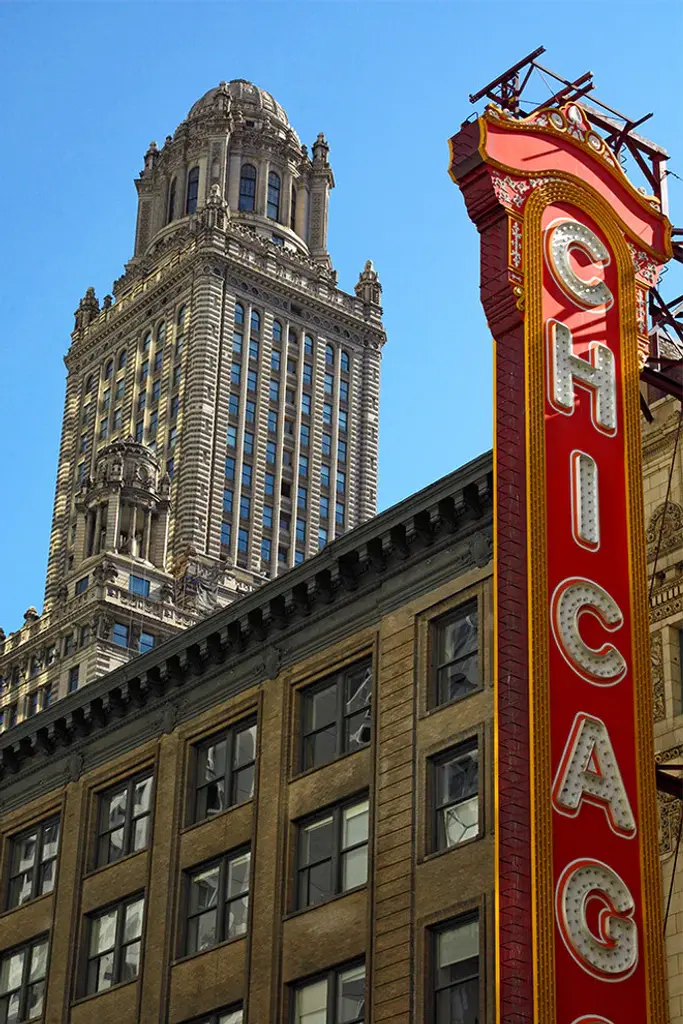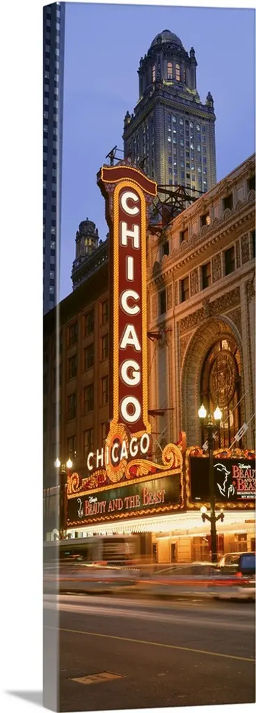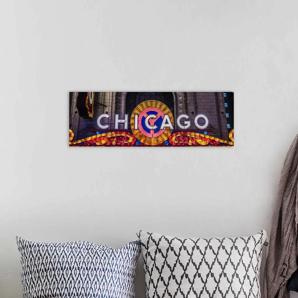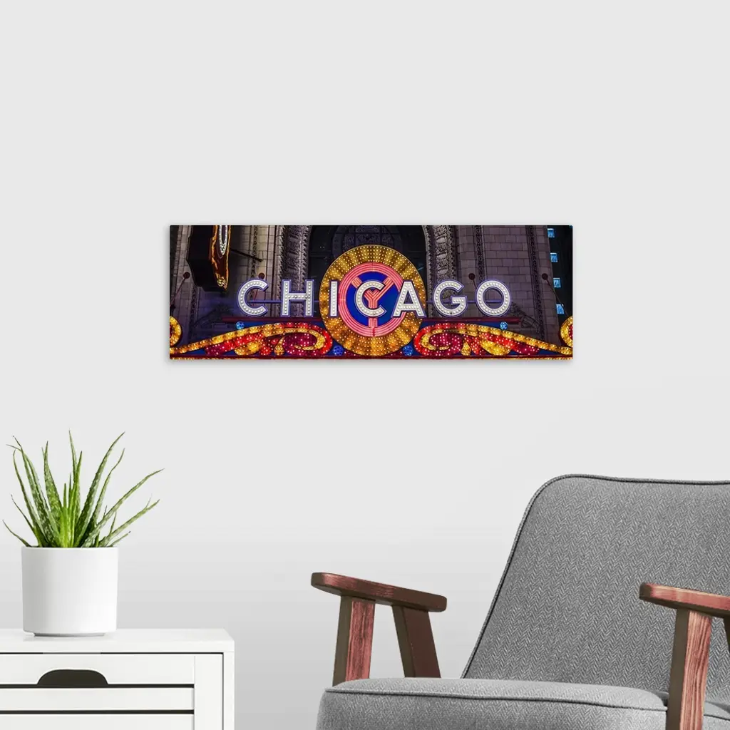 Panoramic image of the Chicago Theater Marquee with glowing lights in the evening.