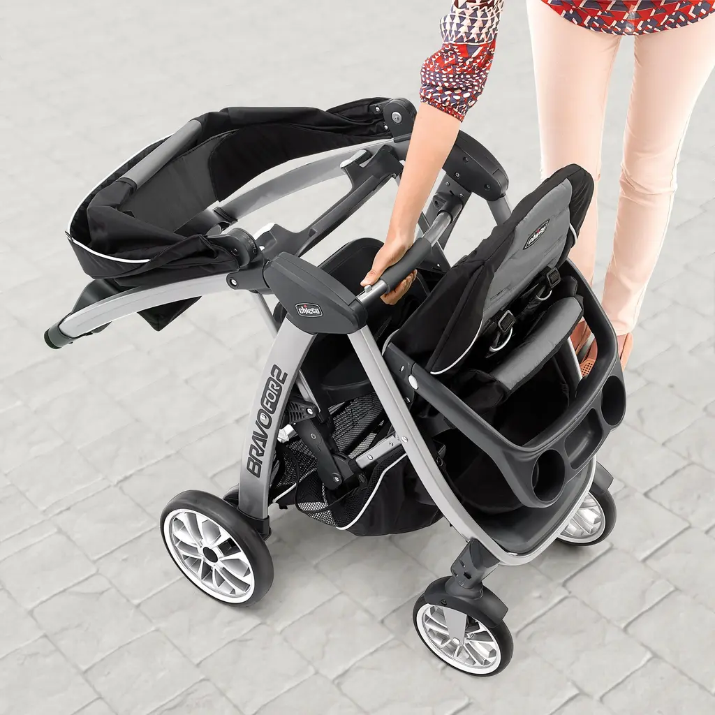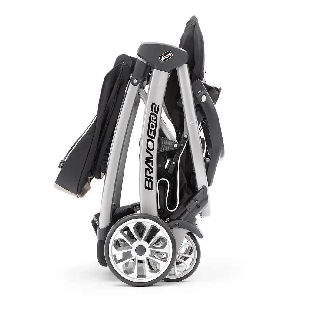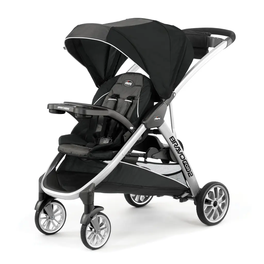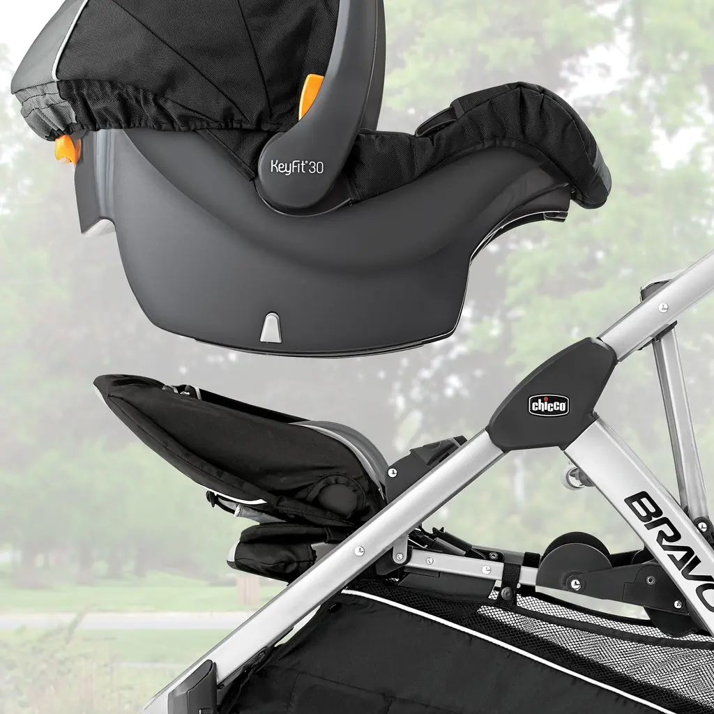 Bravo! For VersatilityFor younger children, BravoFor2® features a traditional padded stroller seat five-point harness, large adjustable canopy, and removable tray with two cup holders. For infants, the stroller seat folds forward to accept a KeyFit®, KeyFit® 30, or Fit2® infant car seat with easy click-in attachment.