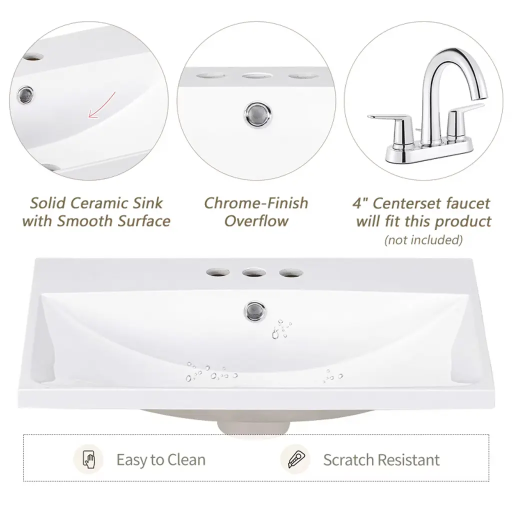 ChicFurnit offers a sleek and functional addition to your bathroom with this ceramic vanity top. Designed with durability and ease in mind, its smooth polished finish resists water stains, making maintenance a breeze. Featuring pre-drilled faucet holes, installation is quick and easy, accommodating a 4-inch faucet. Perfect for smaller Space, this vanity top blends practicality with elegance, giving your bathroom a fresh, stylish update.
