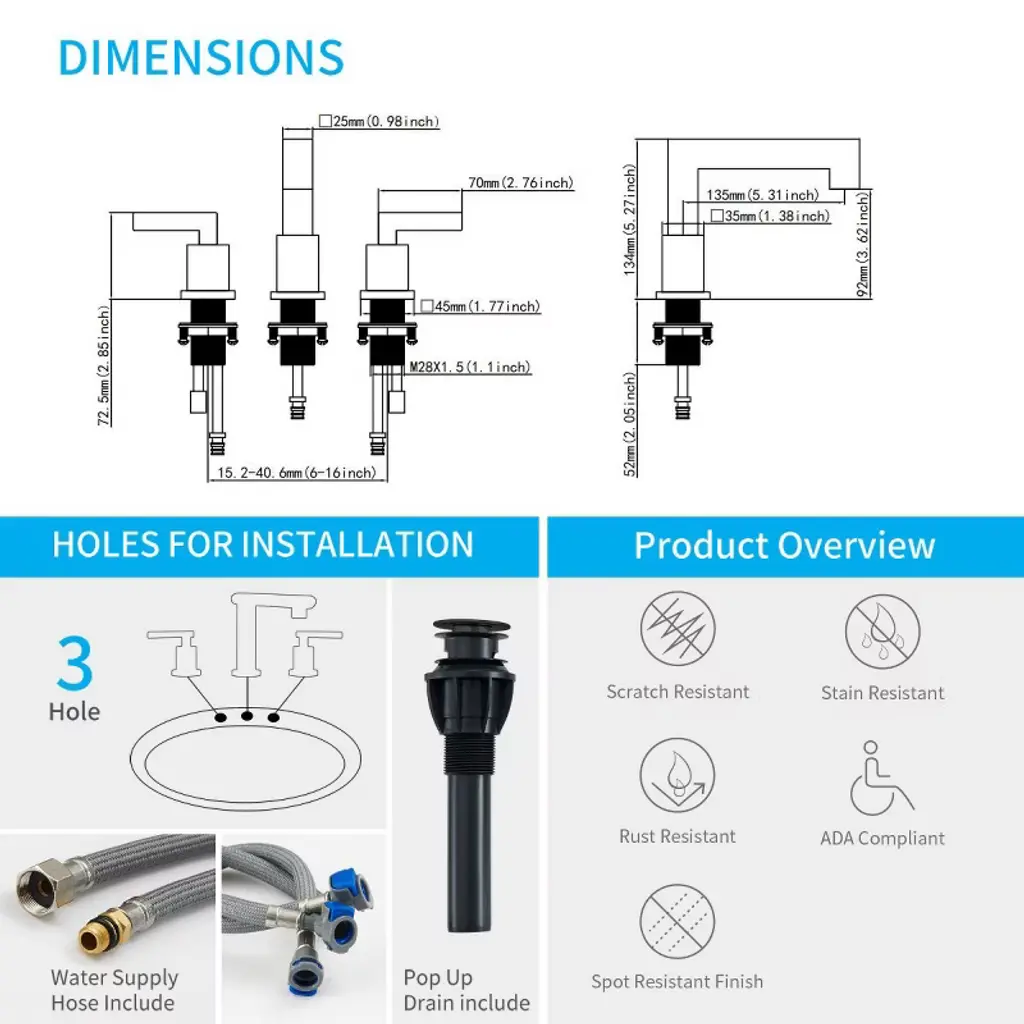 ChicFurnit Bathroom Sink Faucet is crafted from premium 304 stainless steel with a lead-free waterway for enhanced durability. Featuring double straight handles, it offers precise control of water temperature, blending seamlessly into various bathroom designs. The faucet includes a pop-up sink drain, overflow, and braided nylon water supply hoses, making installation easy with clear instructions. This versatile faucet fits 3-hole installations with adjustable distances between 6 to 16 inches.