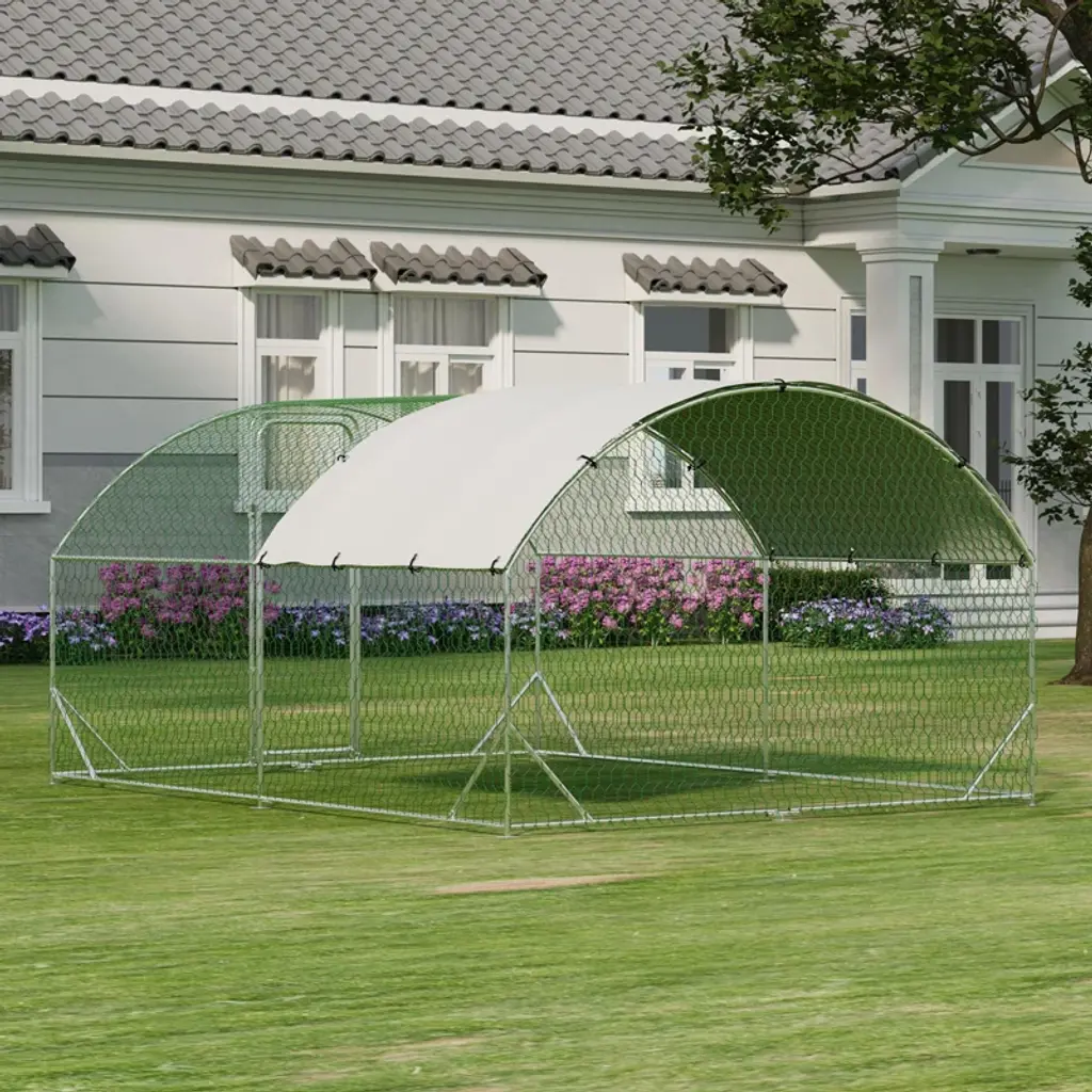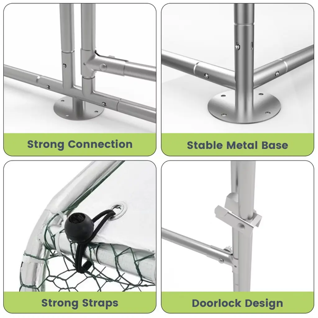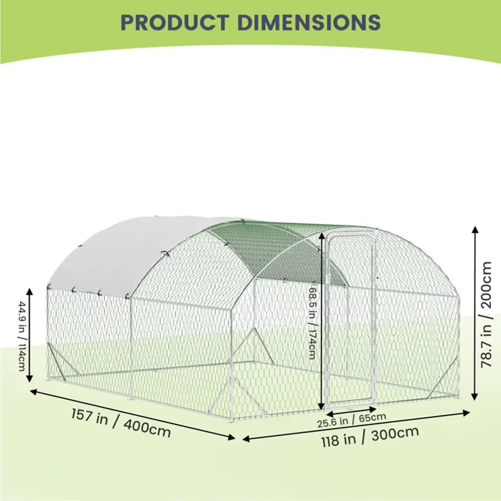 1.Heavy-Duty Steel Structure for All-Weather Stability This chicken run is built with high-quality steel pipes, reinforced by additional support columns and triangular bracing to ensure exceptional stability. The robust frame withstands strong winds, heavy rain, and other harsh weather conditions, providing a secure enclosure year-round. The steel pipes are designed to resist bending or warping, ensuring long-term durability¡ªmaking it a reliable choice for both backyard and farm settings where structural integrity is critical. 2.Spacious, Well-Ventilated Design for Poultry Comfort Measuring 9.8x13.1x6.5 feet, this walk-in chicken coop offers ample space for poultry to roam, forage, and exercise freely. The open, airy interior promotes natural ventilation, reducing moisture buildup and keeping the environment fresh¡ªessential for maintaining healthy chickens, ducks, or rabbits. Reinforced wire mesh lines the structure, creating a predator-proof barrier against foxes, raccoons, and birds of prey, while multiple convenient doors allow easy access for feeding, cleaning, and daily checks. 3.Waterproof UV-Resistant Cover for Weather Protection Equipped with a durable PE cover, this chicken run shields inhabitants from the elements. The cover is both anti-UV (to block harmful sun rays) and waterproof, keeping poultry dry during rainstorms and cool in intense sunlight. The sloped roof design ensures efficient drainage of rain, snow, and debris, preventing accumulation that could strain the frame¡ªso your animals stay protected in every season. 4.Ideal for Backyards & Farms with Easy Access Perfect for backyard or farm use, this chicken run lets your poultry enjoy the outdoors safely. The lockable main door ensures secure containment, preventing escapes and keeping predators out. Its walk-in design makes daily tasks like feeding, egg collection, and cleaning hassle-free¡ªno need to crouch or struggle with small openings. Whether you¡¯re raising a small flock or managing a larger group, it adapts seamlessly to residential or agricultural spaces. 5.Multi-Purpose Shelter for Various Animals Beyond chickens, this versatile enclosure accommodates a range of small animals: ducks, rabbits, geese, quail, and even small pets like puppies or kittens. Its sturdy, adaptable design provides a safe, enclosed space for any small creature needing protection from the outdoors. Whether used as a temporary shelter or a permanent home, it offers the flexibility to meet diverse animal care needs.