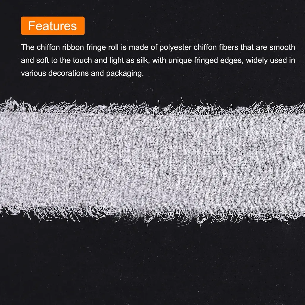 Add a touch of elegance and sophistication to your crafts with this Handmade Fringe Chiffon Ribbon. Made of smooth and soft polyester chiffon fibers, this ribbon is as light as silk. It features unique fringed edges that add a stylish touch to any decoration or packaging. With a width of 1.5 inches and a length of 10 yards, this chiffon ribbon is perfect for wedding invitations, bouquet packaging, photography modeling, and more. Its outstanding texture and soft toughness make it easy to cut and suitable for a variety of styles. Please note that due to the handmade nature of this ribbon, there may be a slight 1-2 cm error in length.Features: