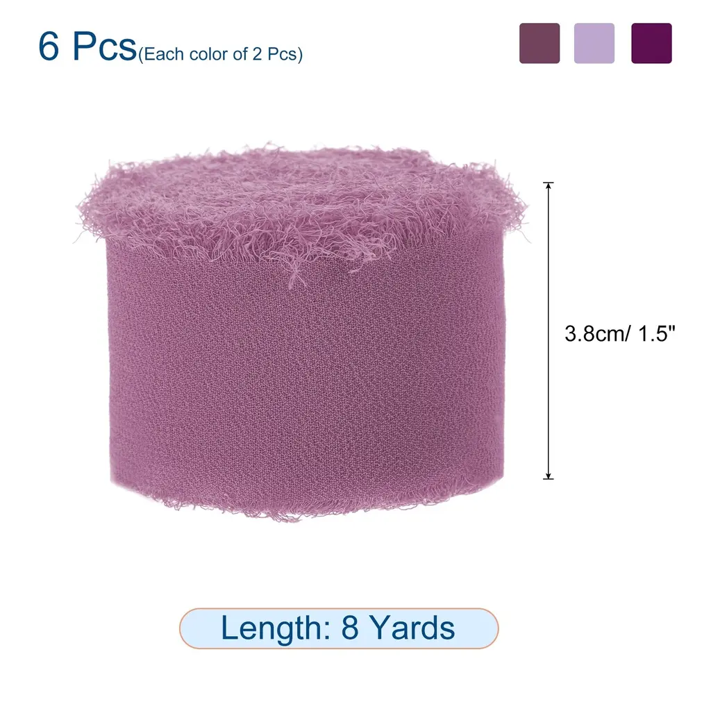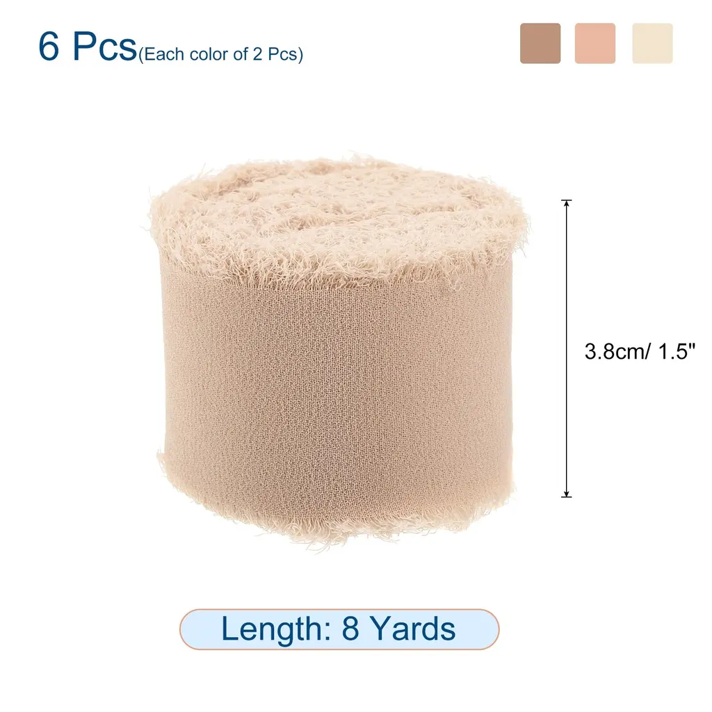 What is this?The chiffon ribbon with tassels on the edge can be matched with some handicrafts, it can be used for wedding invitations, wedding photo modeling, bouquet packaging, photography modeling, party background decoration, etc.What will I get?Package Content: 6pcs x Handmade Fringe Chiffon Silk Ribbon; Each Color 2 Piece; Length: 8 yards; Width: 3.8cm/ 1.5 inch; Material: ChiffonAre there any advantages of the product?The chiffon ribbon fringe roll is made of polyester chiffon fibers that are smooth and soft to the touch and light as silk, with unique fringed edges, widely used in various decorations and packaging.How to use it?The chiffon shredded fringe ribbon has an outstanding texture and soft toughness, making all kinds of decoration instantly elegant sophisticated and stylish, suitable for a variety of styles, smooth and easy to cut.What should I notice?Since the chiffon ribbons are all handmade, please allow 1-2 cm error in length.
