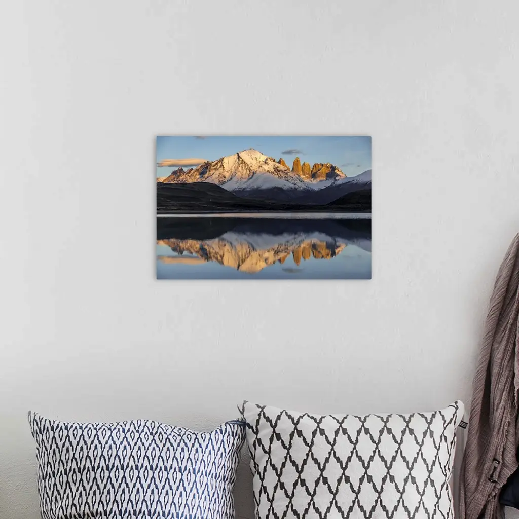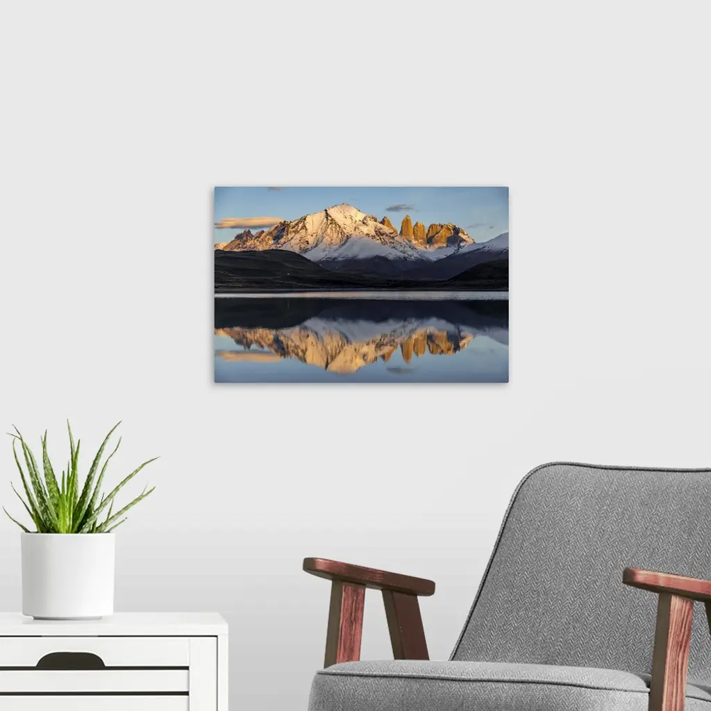 Chile, Patagonia, Torres del Paine National Park, Cordillera Paine, Los Cuernos, Almirante Nieto, Los Torres, Escudo, Reflected in Lago Amarga