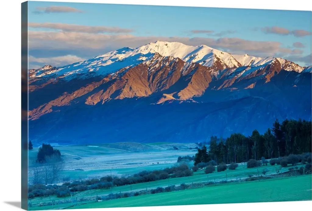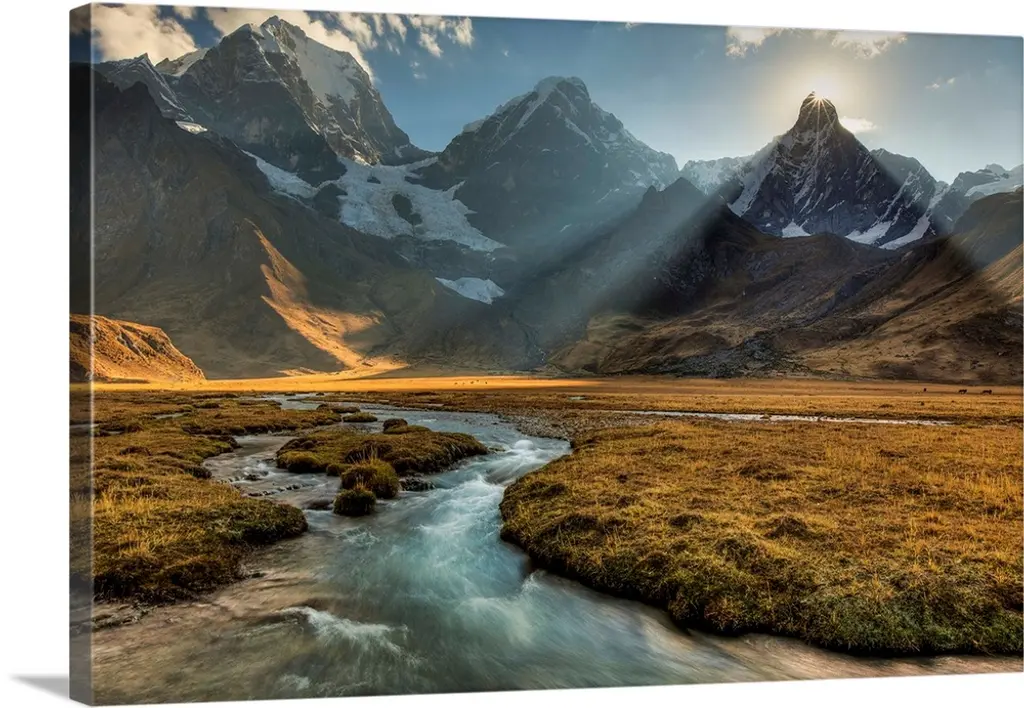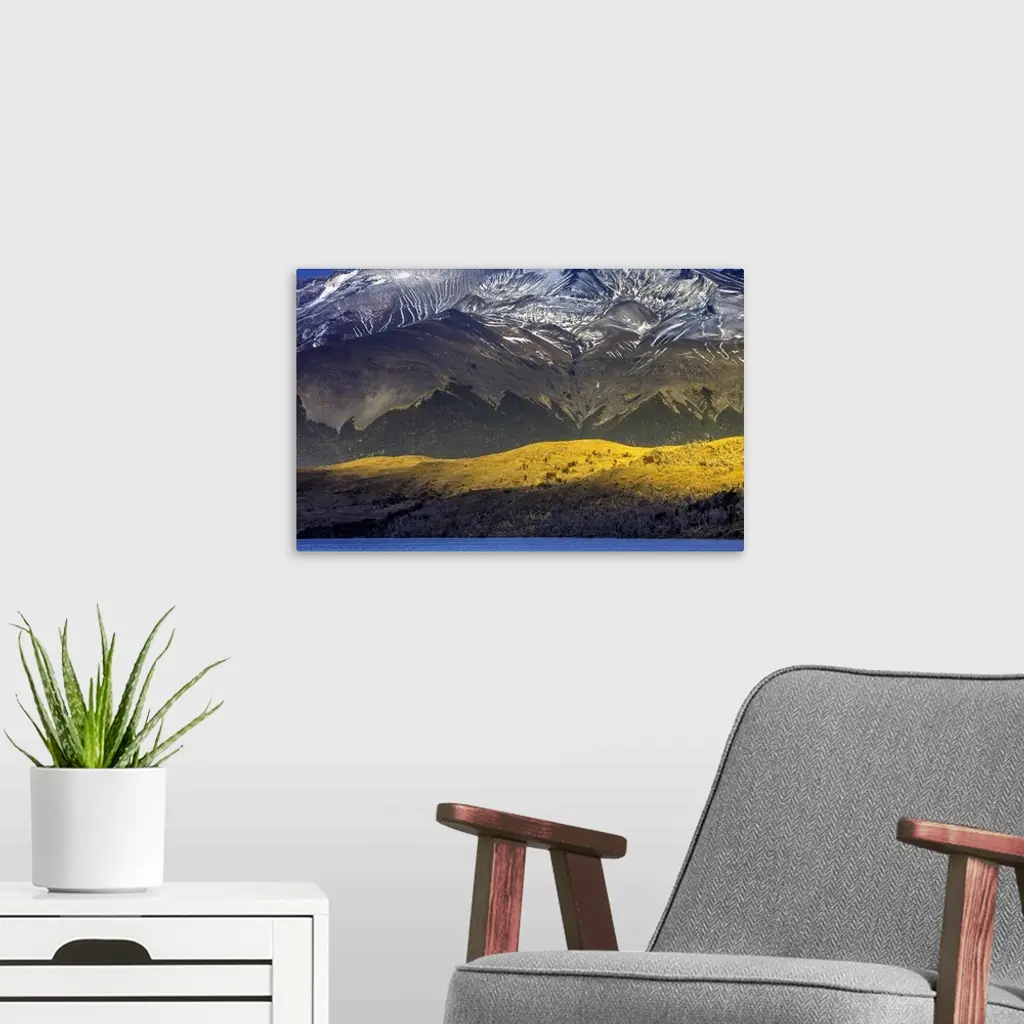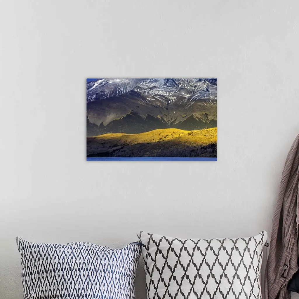 Sunlight on the side of the mountains under the snowy peaks of the Andes in Chile.
