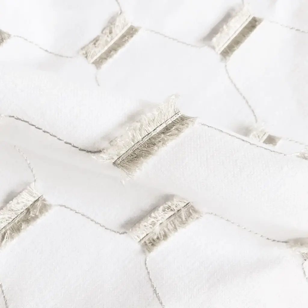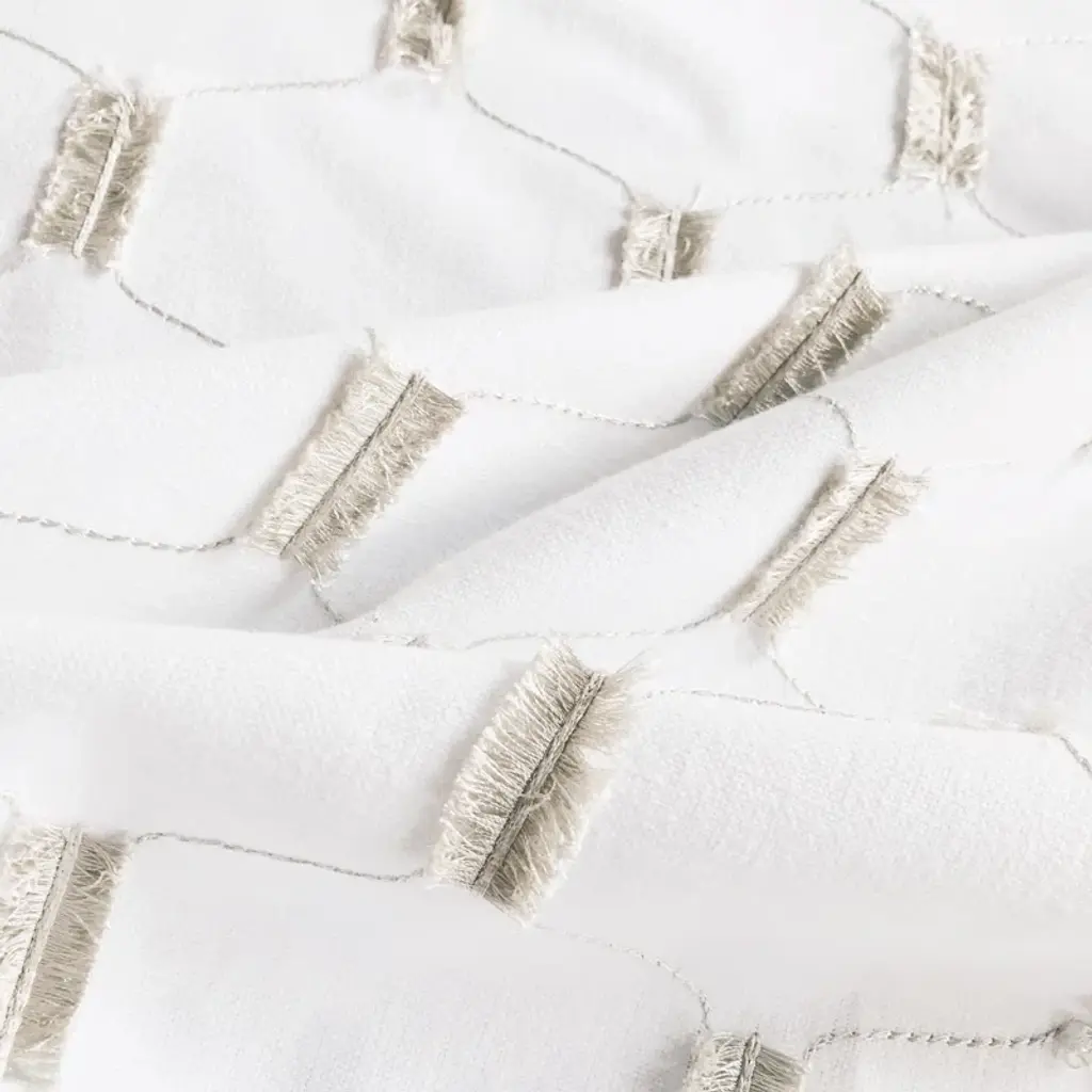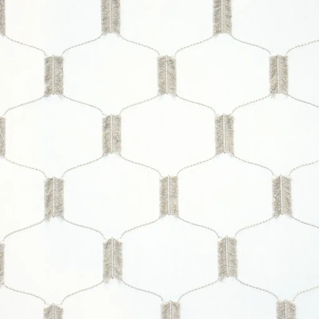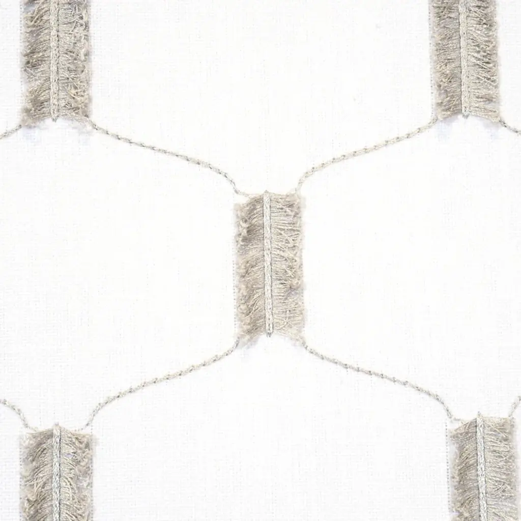 This luxe ivory fabric features an intricately embroidered lattice design. The pattern includes pieces of fil coupe embroidery, giving the pillow frilly textural embellishments.