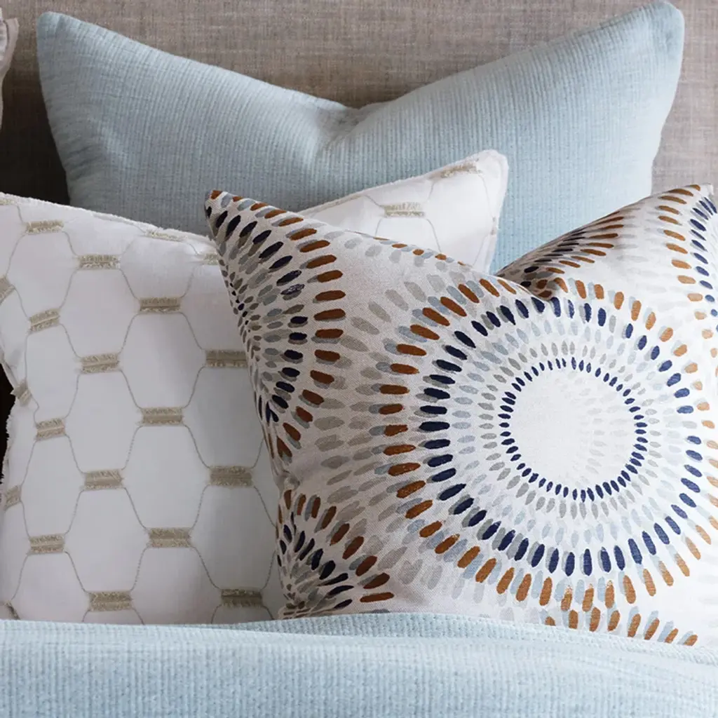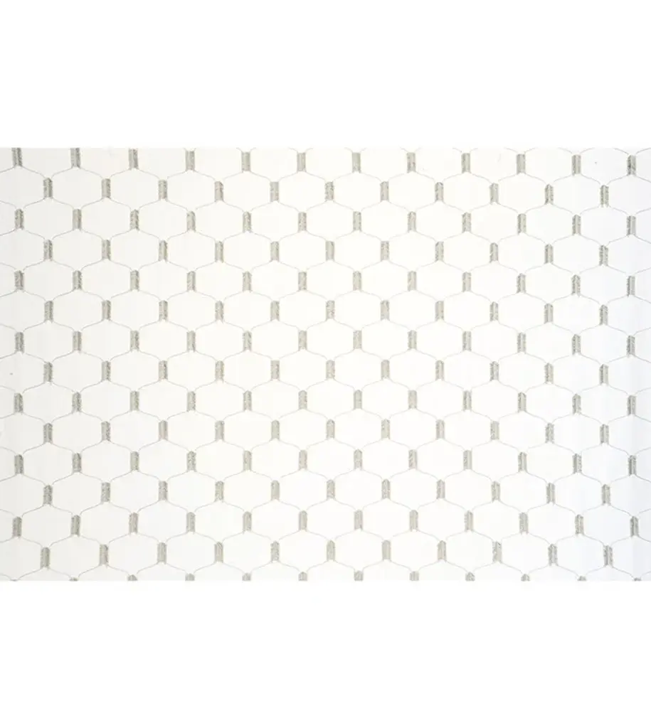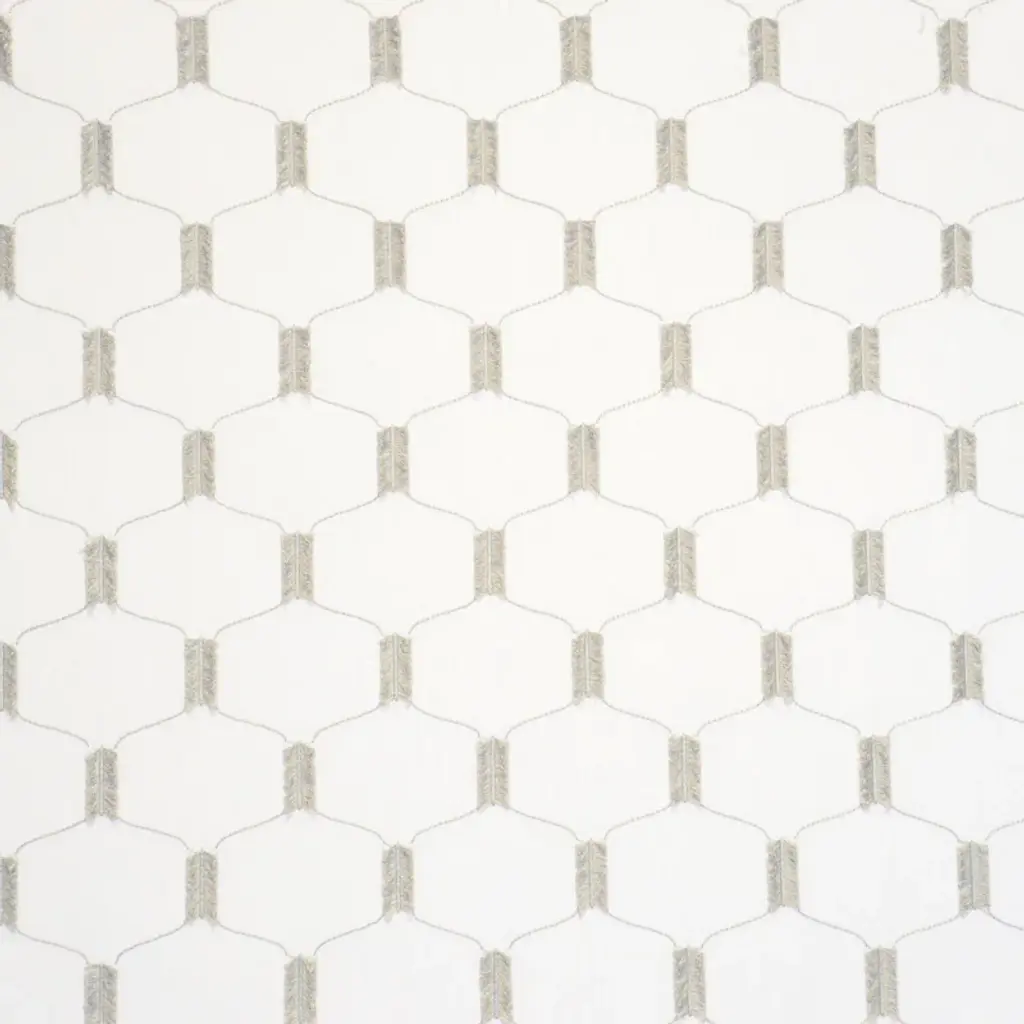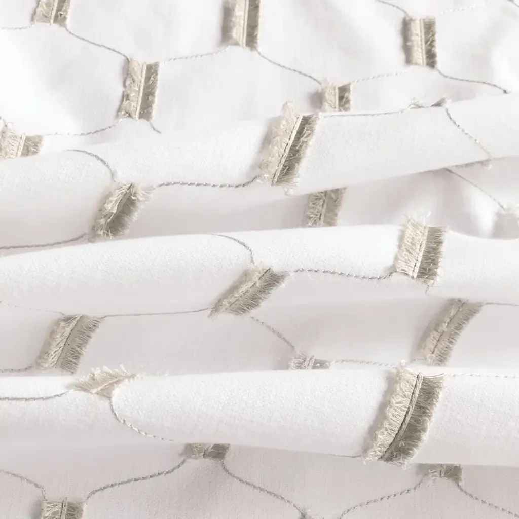 This luxe ivory fabric features an intricately embroidered lattice design. The pattern includes pieces of fil coupe embroidery, giving the pillow frilly textural embellishments.
