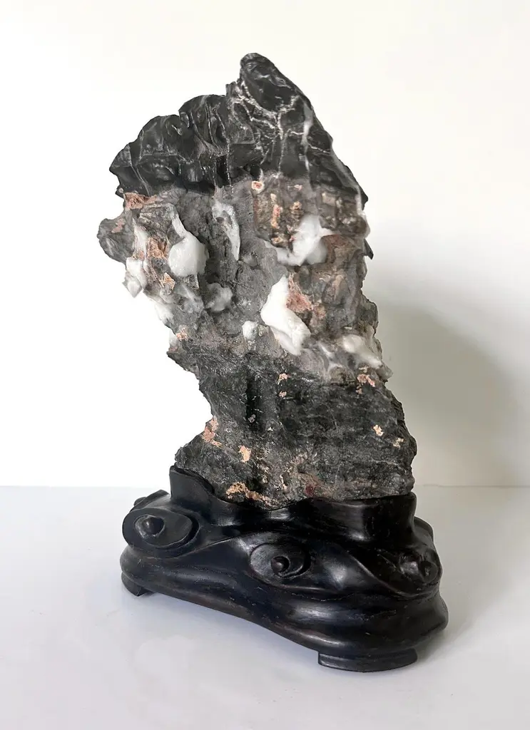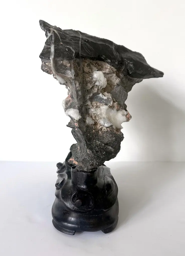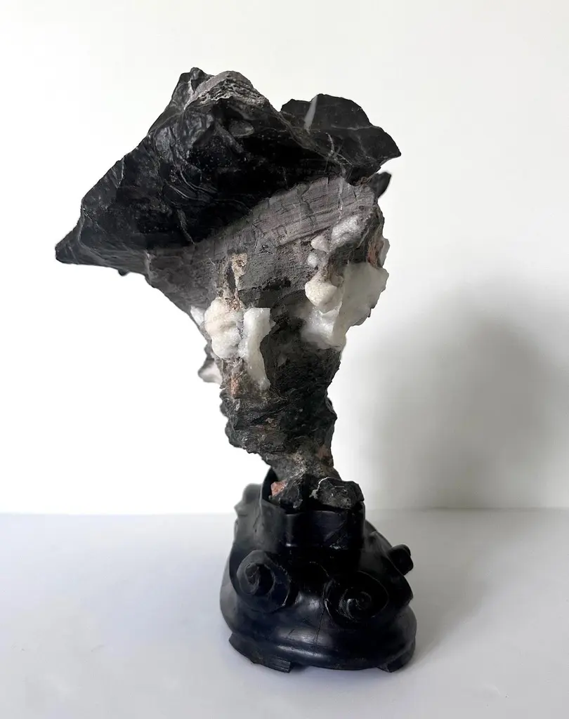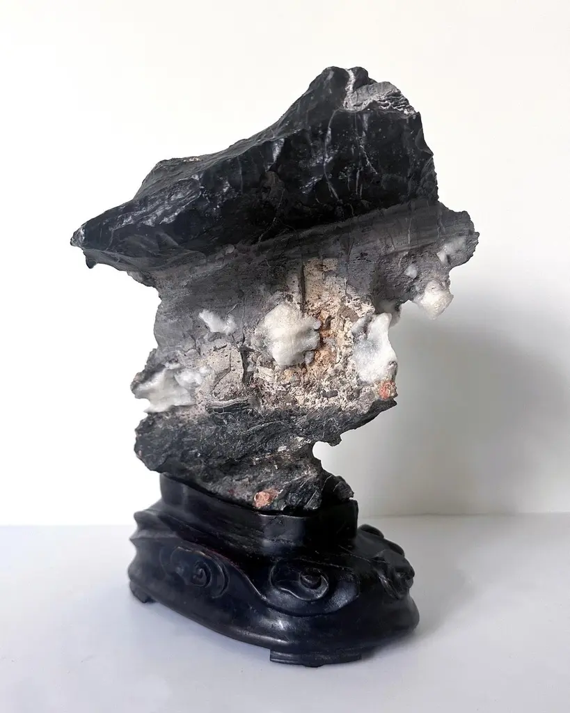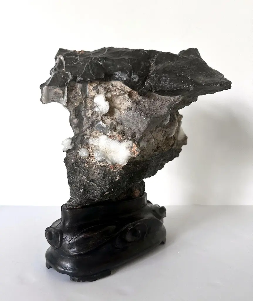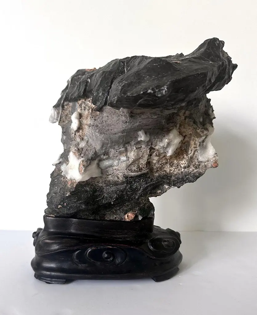 Chinese Black Lingbi Scholar Stone With White Crystal On Display Stand