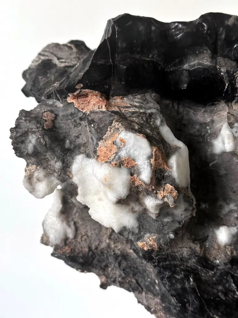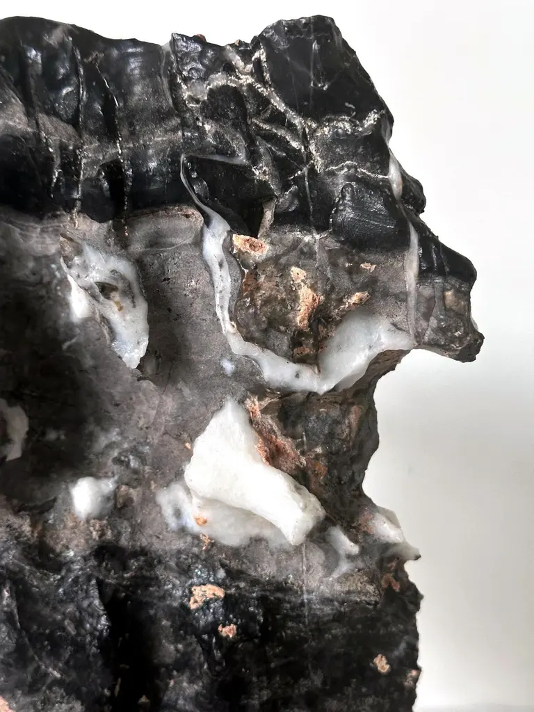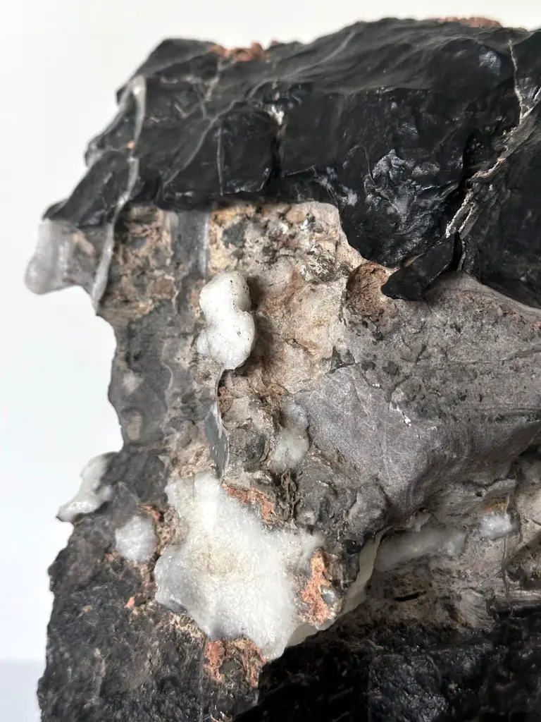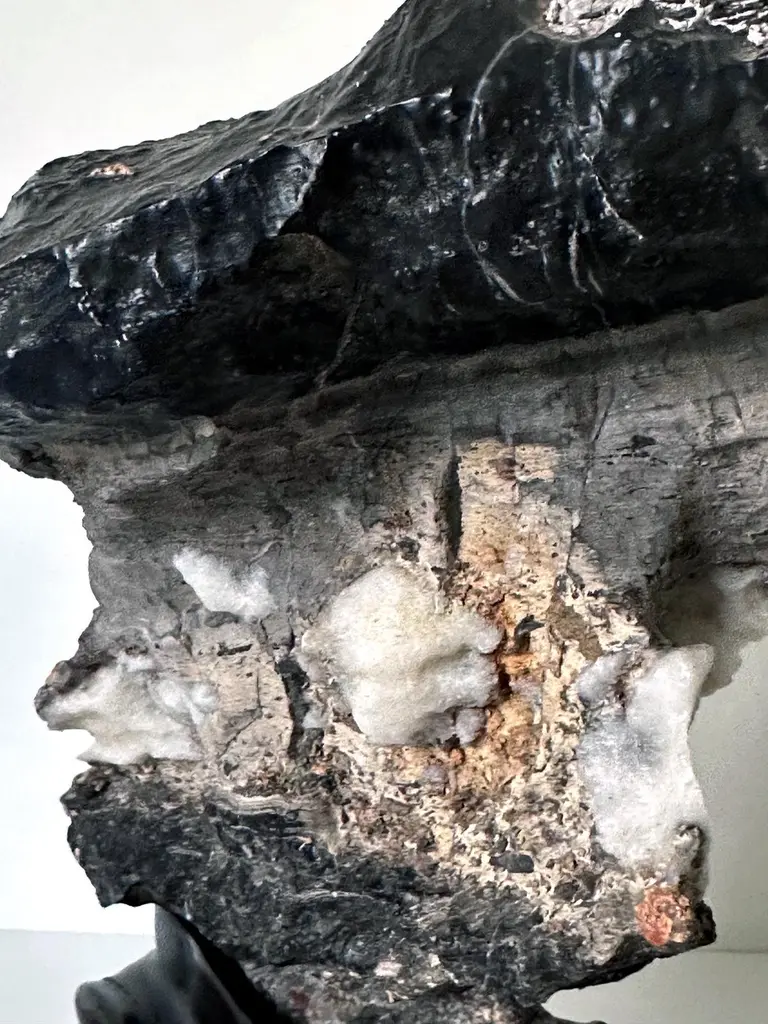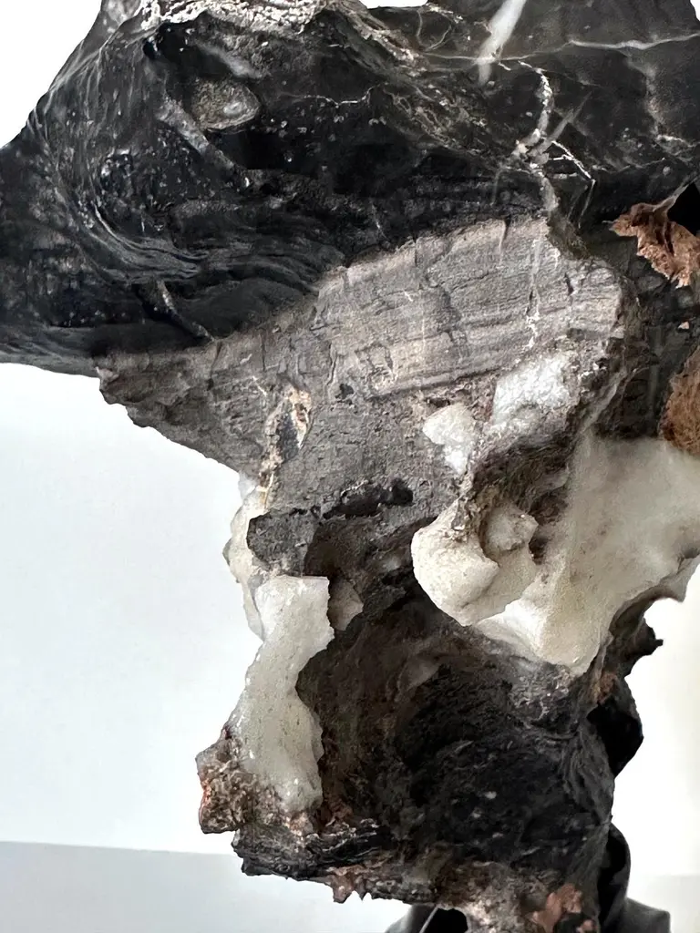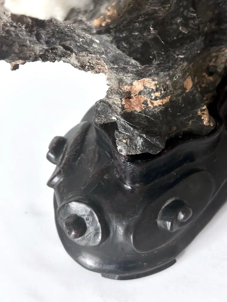 Chinese Black Lingbi Scholar Stone With White Crystal On Display Stand