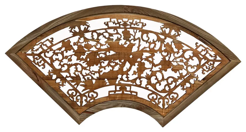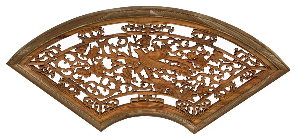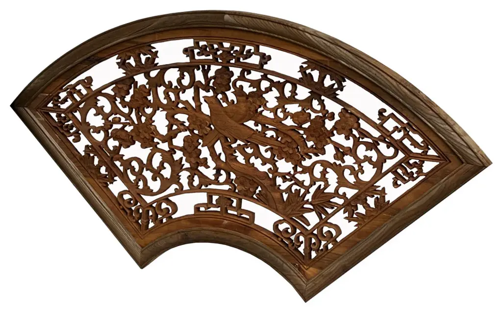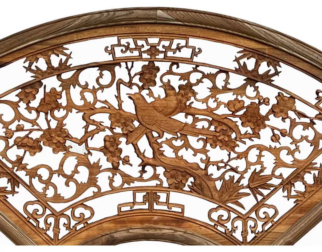 You are looking at this Chinese handmade fan shape wall hanging decor panel with Chinese birds and flowers carving and a light brown stain finish. It is a great piece of art for any wall-hanging decoration.Dimensions: 41.5" x h21" thickness 1.25"Origin: ChinaMaterial: WoodCondition: Handmade, natural wood imperfection and marksUSA domestic continental buyers of 48 states pay $140 shipping (buyers of Hawaii, Alaska, US Islands, Florida Keywest, and Canada pays the extra shipping cost). Insurance and handling charges are already included in the shipping cost.