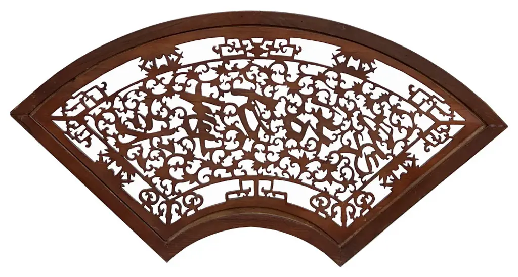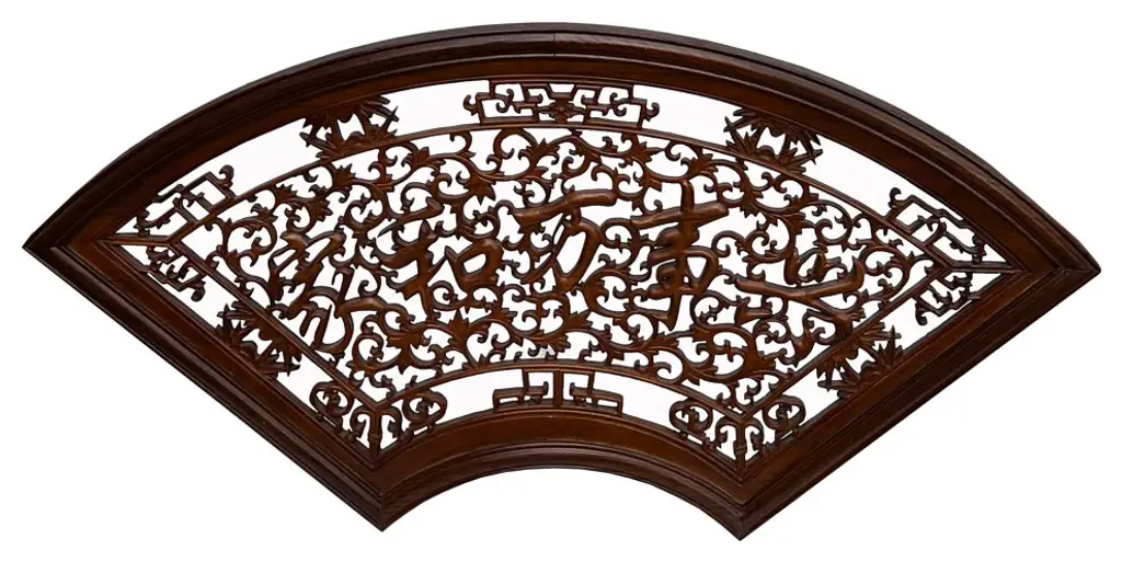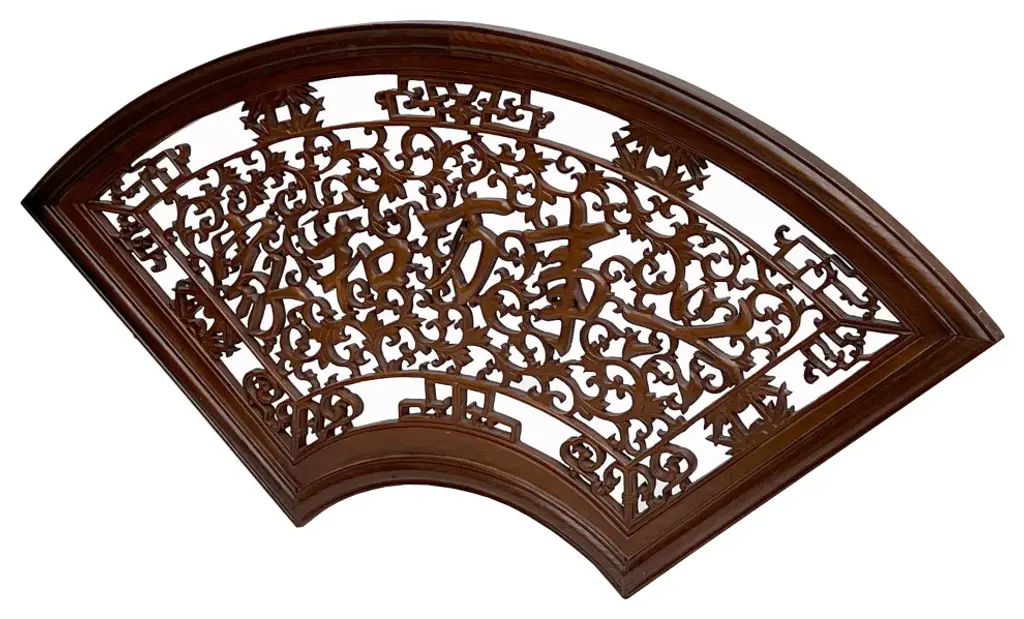 You are looking at this Chinese handmade fan shape wall hanging decor panel with Chinese characters carving ( a harmonious family cultivates prosperity ) and a medium brown stain finish. It is a great piece of art for any wall-hanging decoration.Dimensions: 41.5" x h21" thickness 1.25"Origin: ChinaMaterial: WoodCondition: Handmade, natural wood imperfection and marksUSA domestic continental buyers of 48 states pay $140 shipping (buyers of Hawaii, Alaska, US Islands, Florida Keywest, and Canada pays the extra shipping cost). Insurance and handling charges are already included in the shipping cost.