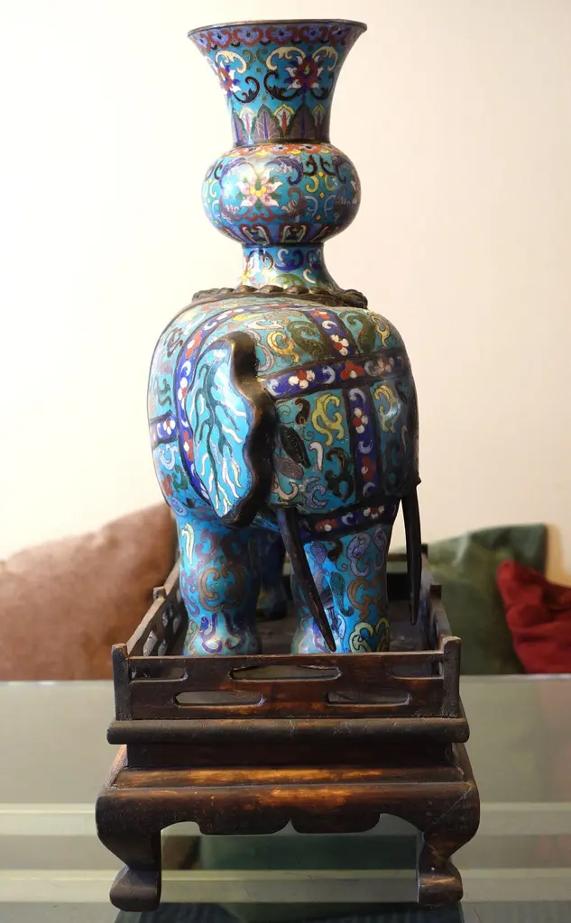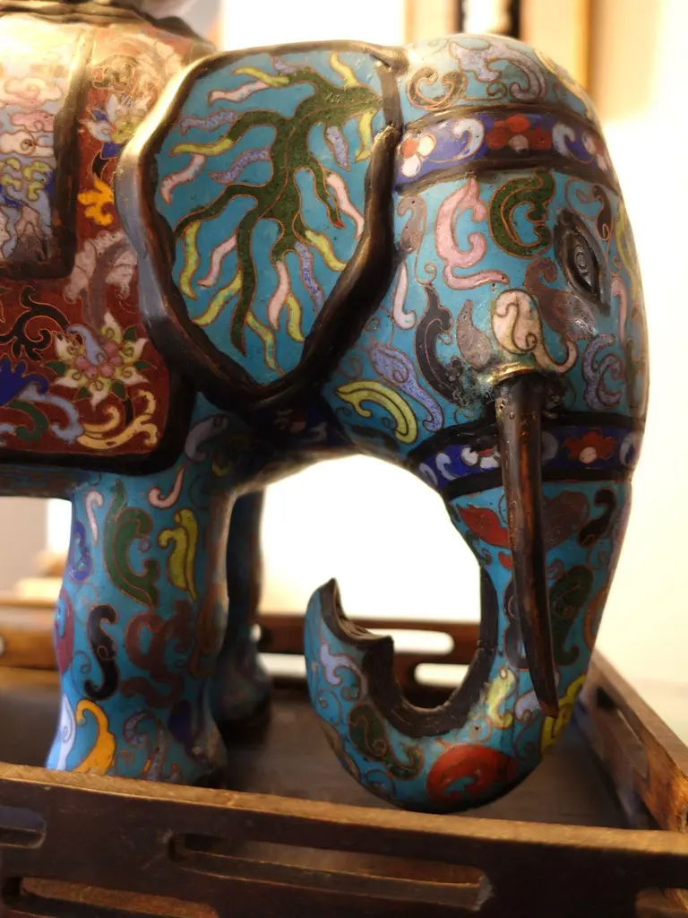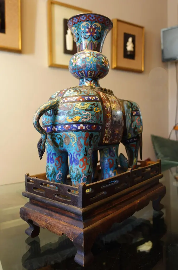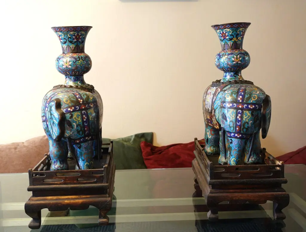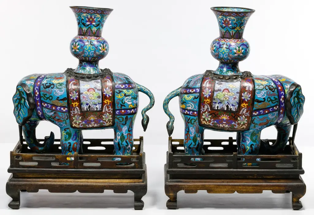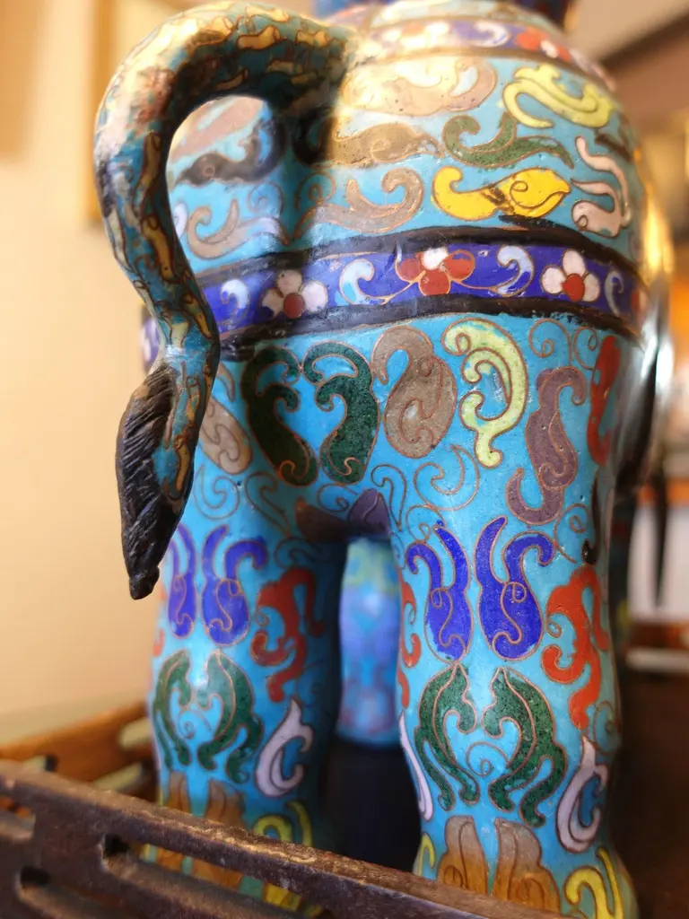 Chinese Pair Of Large Cloisonné Elephants With Wood Stands