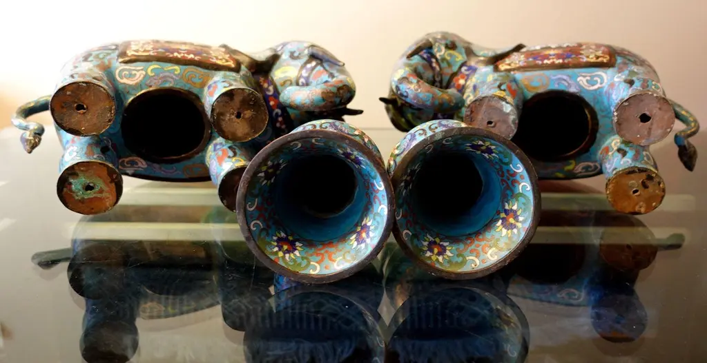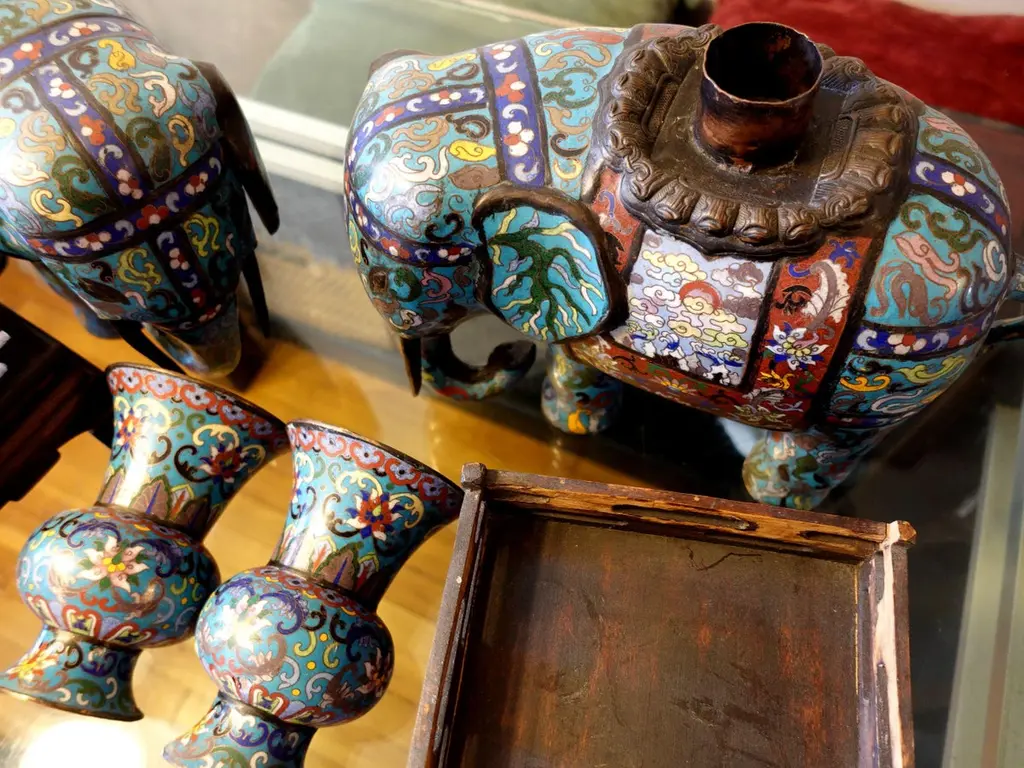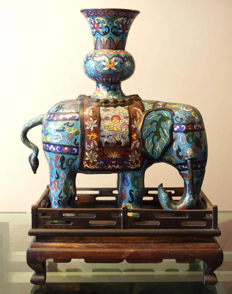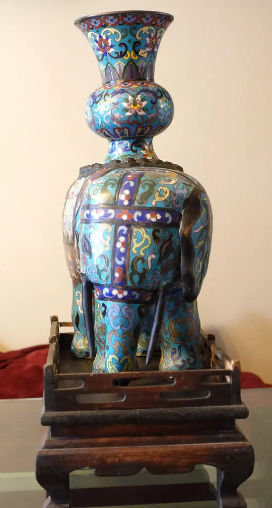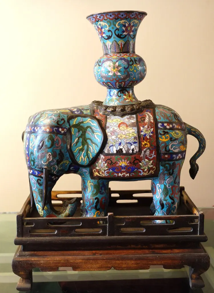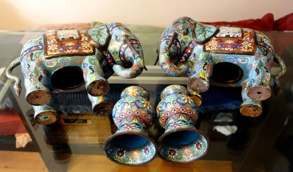 Chinese Pair Of Large Cloisonné Elephants With Wood Stands