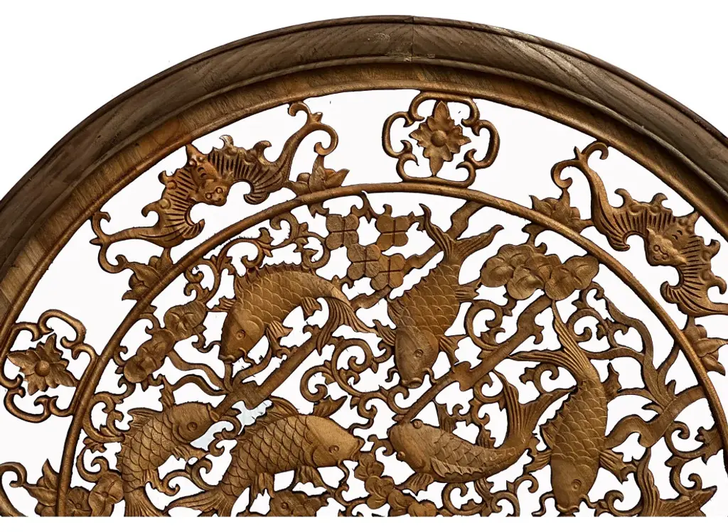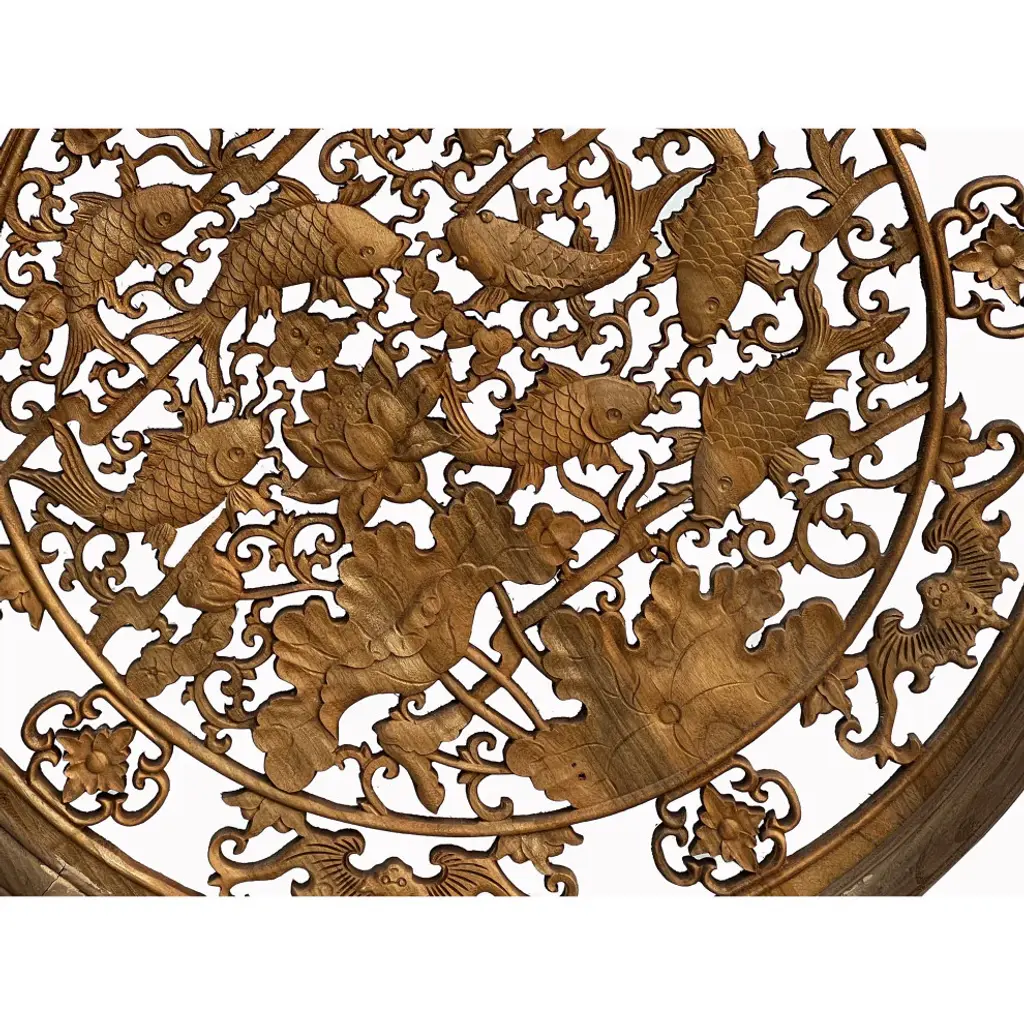 You are looking at this Chinese handmade round shape wall hanging decor panel with koi fishes in a lotus pond carving and a light brown stain finish. It is a great piece of art for any wall-hanging decoration.Dimensions: Dia 31.75" x thickness 1.25"Origin: ChinaMaterial: WoodCondition: Handmade, natural wood imperfection and marksUSA domestic continental buyers of 48 states pay $135 shipping (buyers of Hawaii, Alaska, US Islands, Florida Keywest, and Canada pays the extra shipping cost). Insurance and handling charges are already included in the shipping cost.
