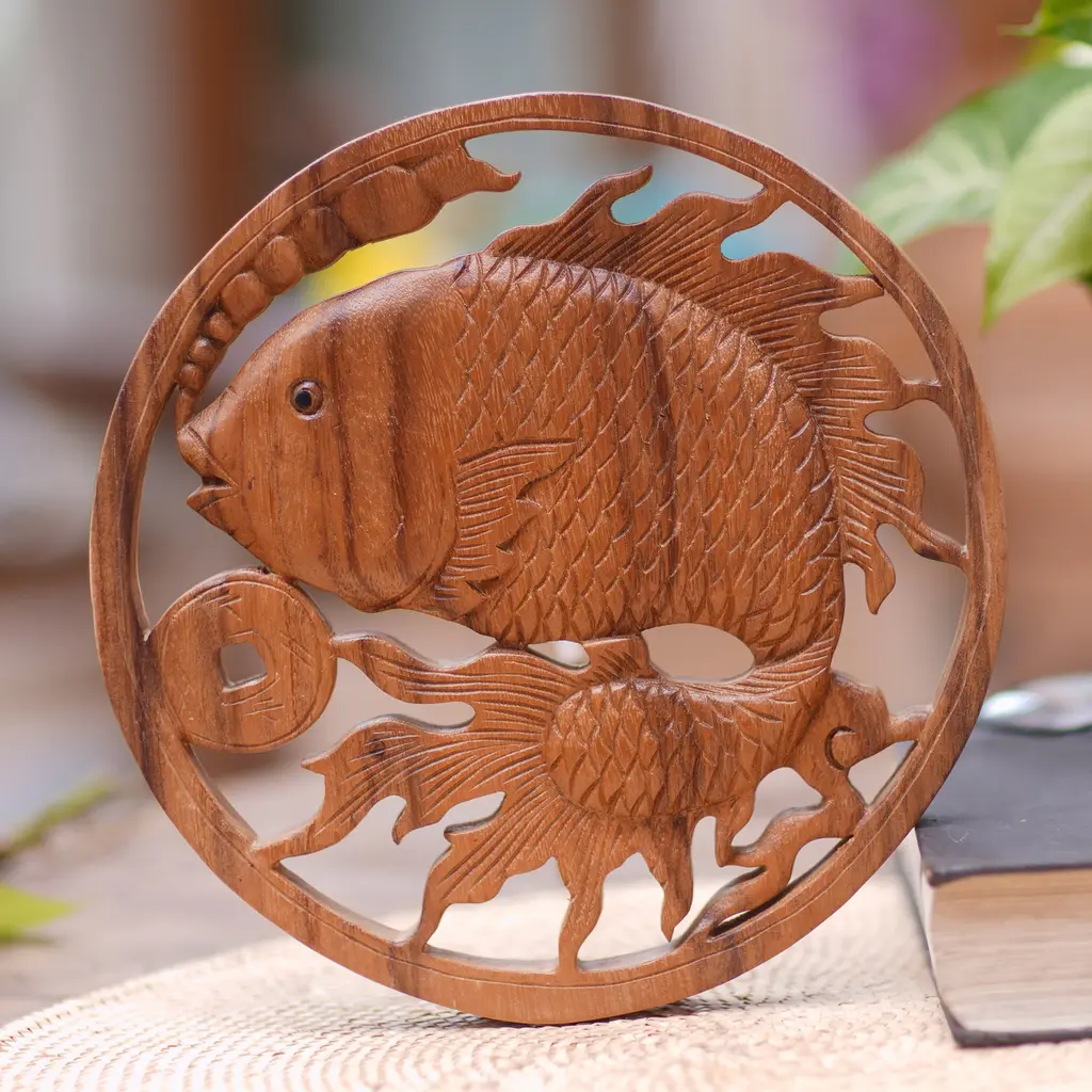 Chinese Round Shape Koi Fishes Lotus Wood Wall Hanging Panel Hws2968