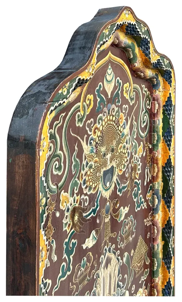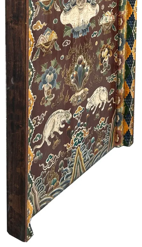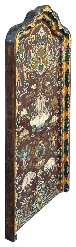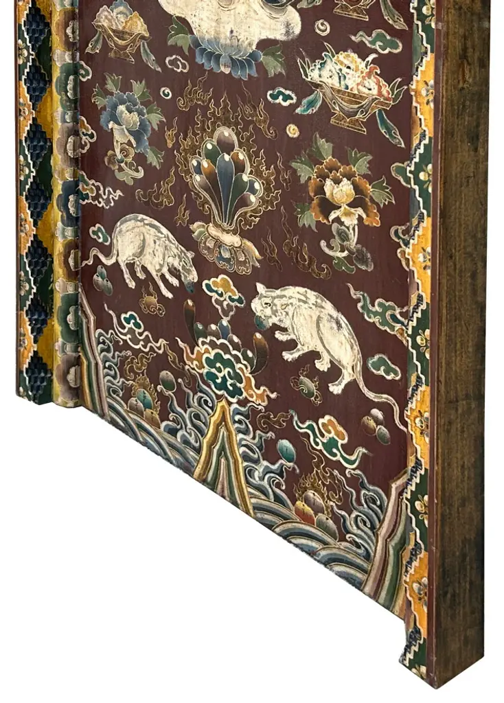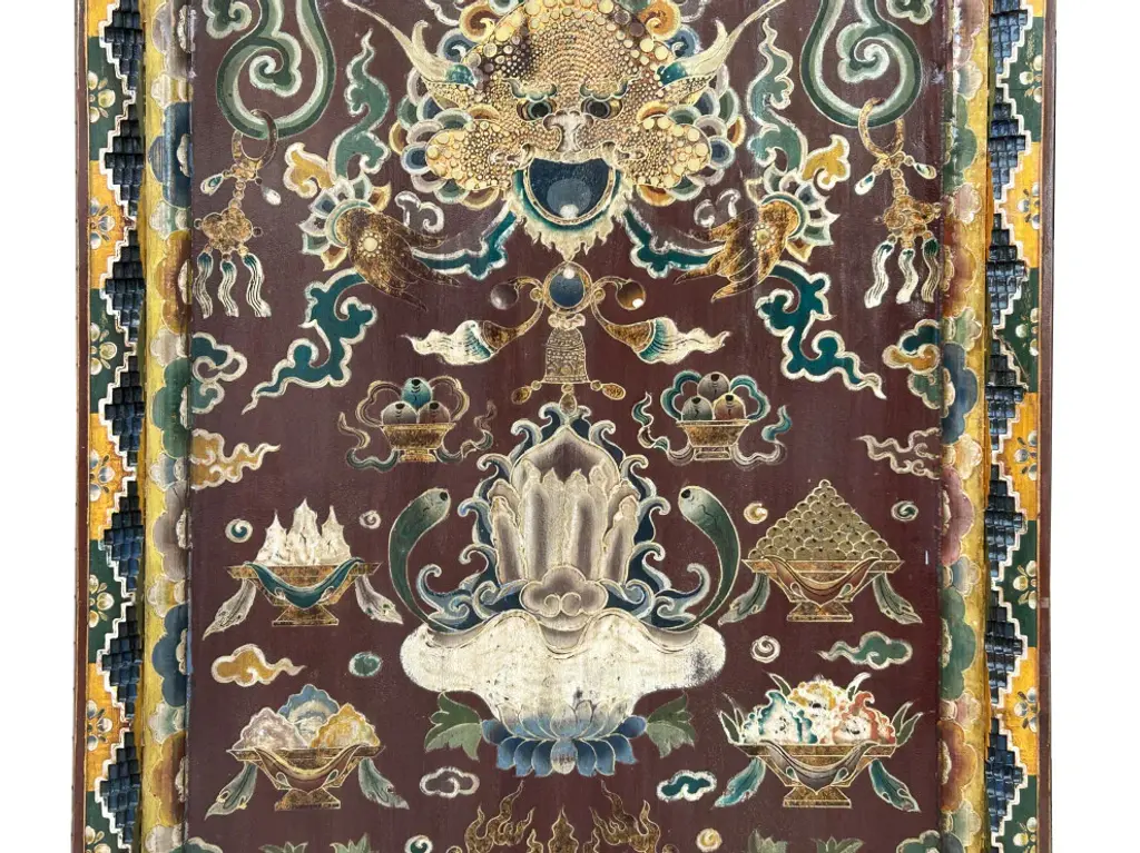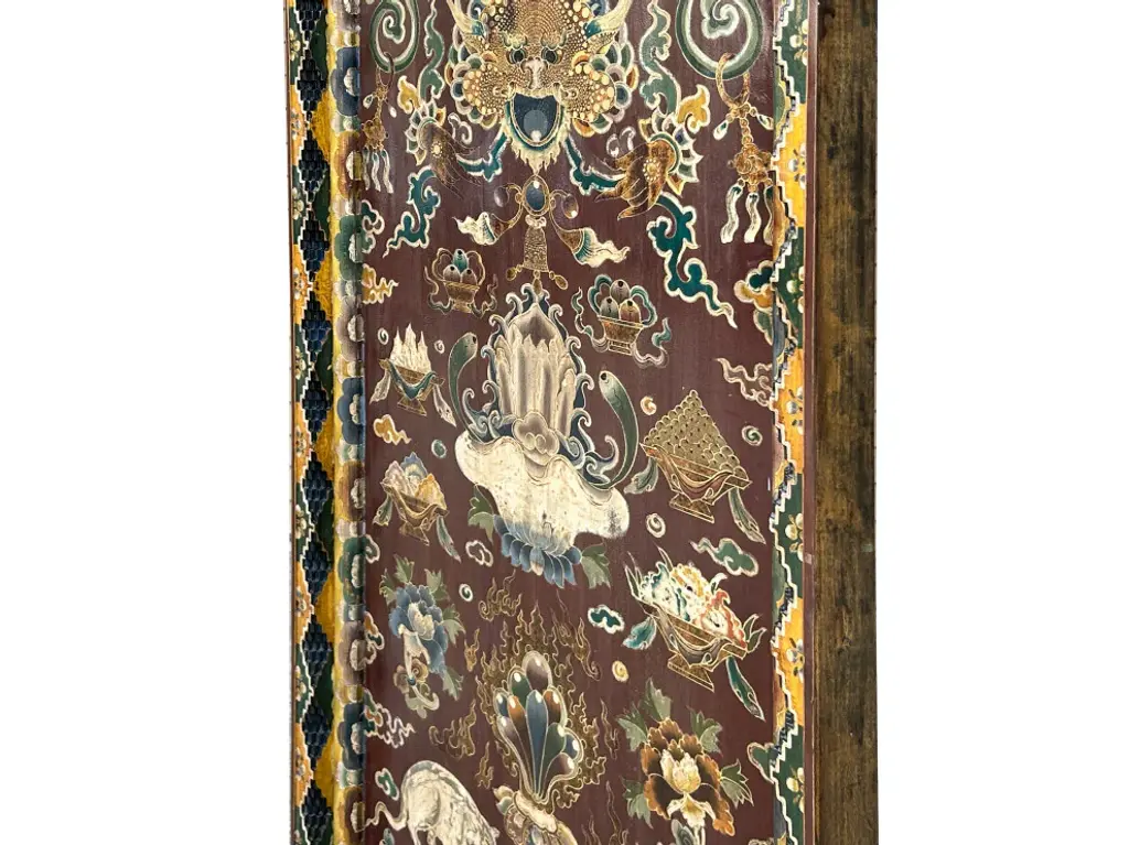 This intricately hand-painted Tibetan Shrine Panel is a captivating work of art. The rich colors, intricate patterns, and symbolic imagery evoke a sense of spiritual reverence. The panel features a central lotus flower motif, representing purity and enlightenment, surrounded by auspicious symbols and protective deities. This unique piece would make a stunning addition to any home decor, adding a touch of cultural significance and spiritual energy to your space. Whether displayed as a focal point or integrated into a meditation corner, this Tibetan Shrine Panel is sure to inspire and uplift.Dimensions: w29.5" x thickness 3" x h61"Origin: ChinaMaterial: Elm WoodCondition: Vintage handmade, unique not perfect, rustic finish, minor color offWe offer a flat shipping fee of $325 for customers in the contiguous United States (48 states) for convenient curbside delivery. (Additional shipping costs will apply to customers in New York, Hawaii, Alaska, US Islands, Florida Keywest, or Canada, based on their specific location). The shipping cost includes insurance and handling charges for added protection.For customers in San Francisco or the Bay Area, we provide local delivery at a cost determined by the distance. You can find the exact cost by entering your zip code during checkout. Alternatively, you can pick up your order in-store with no extra shipping fee.If you need extra care and a white-glove experience, we offer a specialized service with a 4-8 week transit time, tailored to your destination. Contact us for a detailed quote on this service.Upon receiving your shipment, please carefully inspect the exterior packaging while the delivery personnel are present. Note any visible damage on the delivery paperwork, as carriers do not typically honor concealed damage claims. Your cooperation in documenting any visible damage is greatly appreciated